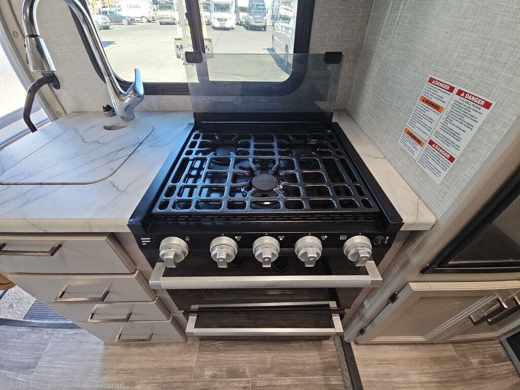 With any Geneva Class C gas motorhome by Thor Motor Coach, the interior offers coastline gray flat panel cabinet doors with glacier decor and decorative glass inserts in the kitchen overhead cabinet doors for style, pressed laminated countertops for durability and easy care, and leatherette furniture for comfort, plus conveniences such as a waste basket in the kitchen, a wall cubby with net and USB charging port, and a Showermiser hot water recycling system. The fiberglass front cap with skylight and power shade is a popular feature since it provides natural lighting and beautiful views out of the front, the lighted rotocast storage compartments have a single on/off interior switch allowing you to store items safely during the day or night, the Pet-Link multi-purpose tie down is an added safety feature, plus there are many more standout features. And depending on the coach you choose, there is solar prep or a solar charging system.