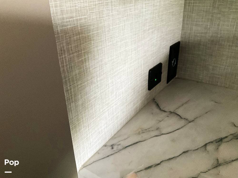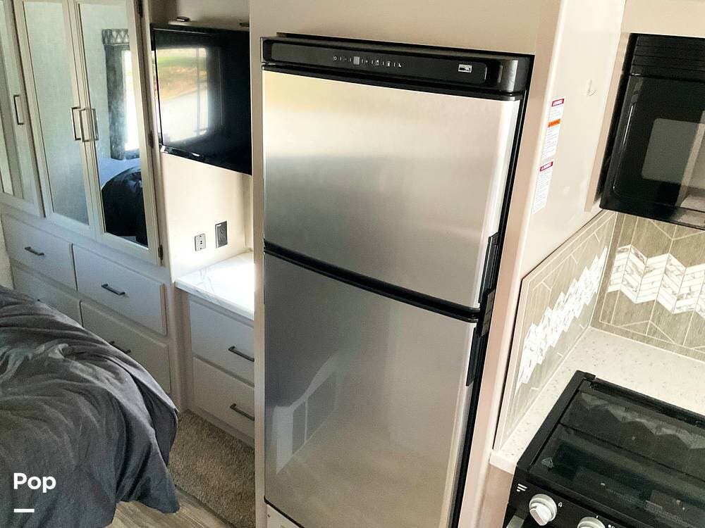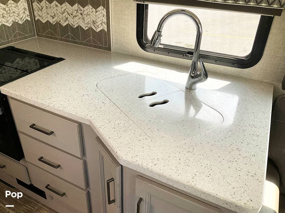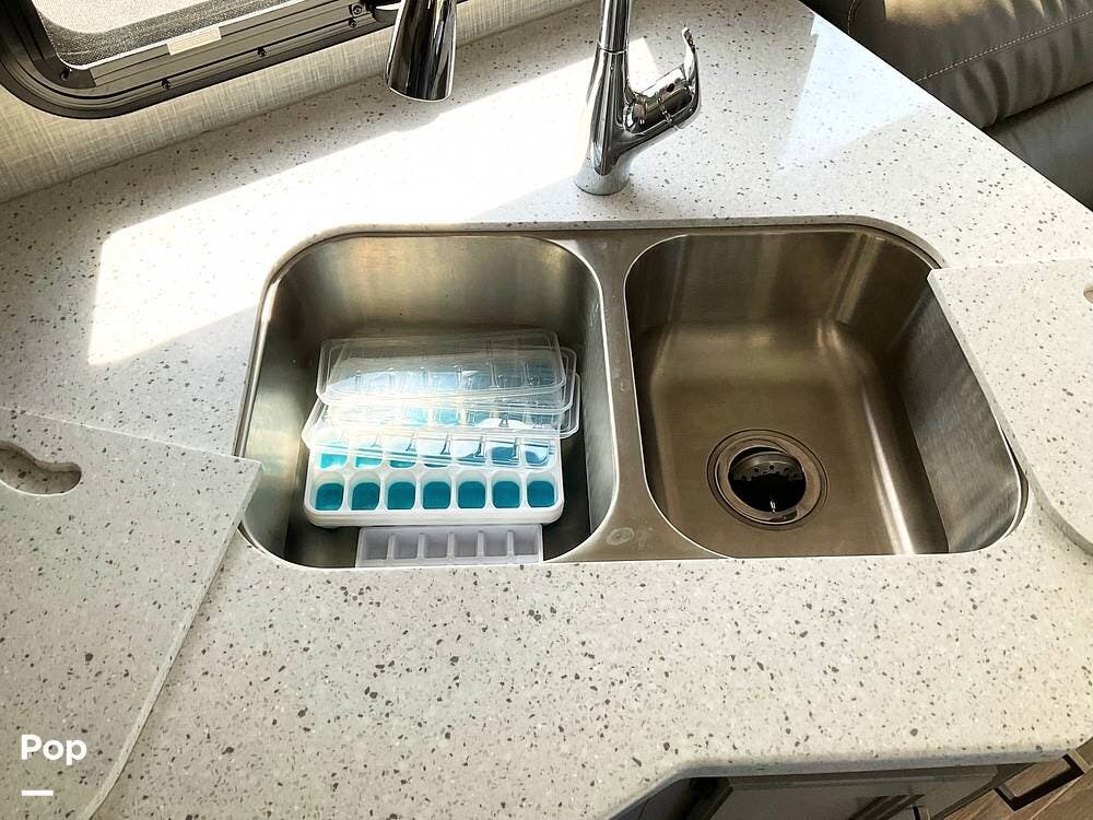 Inside, the full-length driver-side slide opens up the coach and creates a roomy main living area with space for family or guests. The interior is finished with solid-surface countertops, LED lighting throughout, and a layout that makes the coach feel open and comfortable. The kitchen is equipped with a stove, oven, double-door refrigerator, and a double stainless sink, giving you the essentials needed for meal prep whether you're away for a weekend or a longer trip.