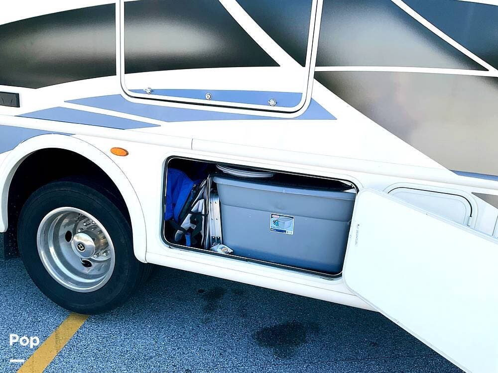 Outside, this 29M continues to offer the features many buyers are looking for in a modern gas Class A. The powered awning has integrated LED lighting and is reported to be in good working order. There is also an outdoor kitchen, exterior TV, exterior shower, and generous storage both inside and in the basement compartments below. Kept stored under an RV carport, this Hurricane 29M presents as a well-cared-for coach with a strong combination of comfort, convenience, and travel-ready features