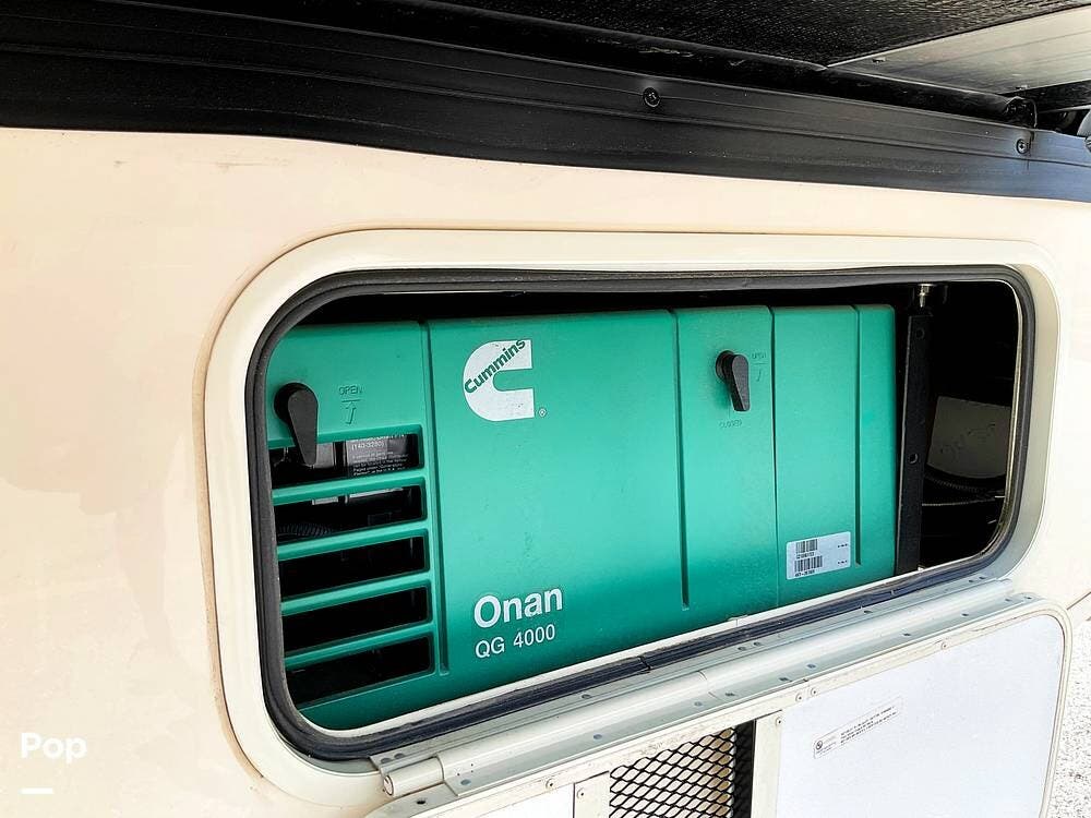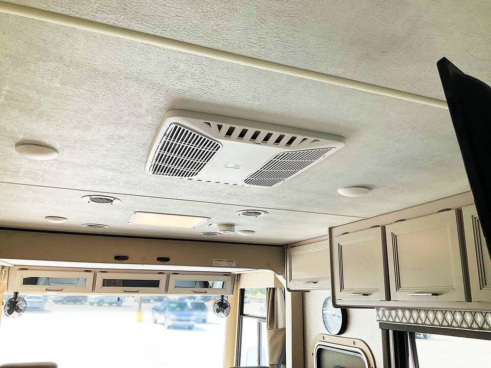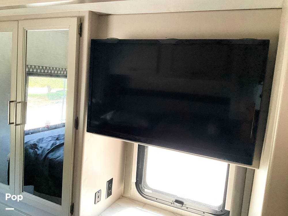 The sleeping arrangements make this Hurricane especially versatile, with room to sleep up to eight. The rear bedroom features a king bed with a new topper, and the coach also includes additional convertible sleeping areas to accommodate guests. Two interior flat-screen TVs provide entertainment inside, and the seller notes that the rear air can be turned on remotely so the RV can begin cooling before everyone settles in.