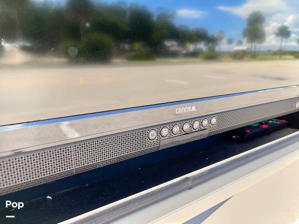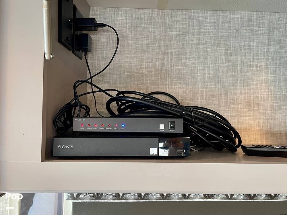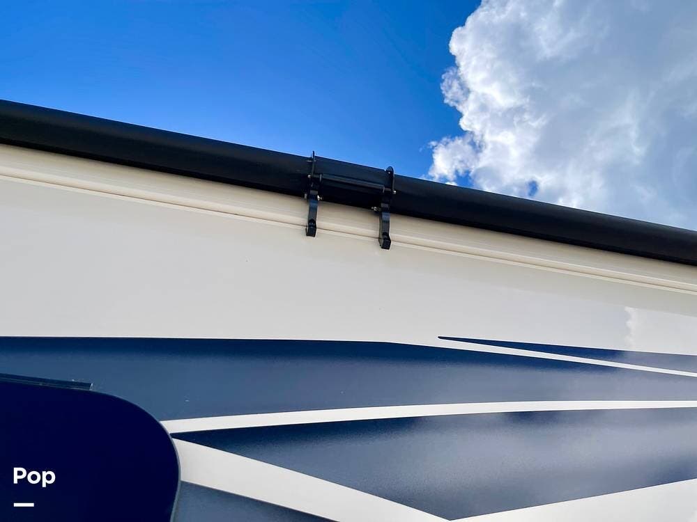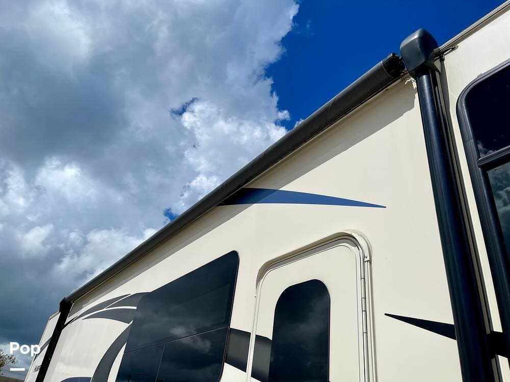 Outside, features include an exterior entertainment center, power awning with LED lighting, and ample storage bays.