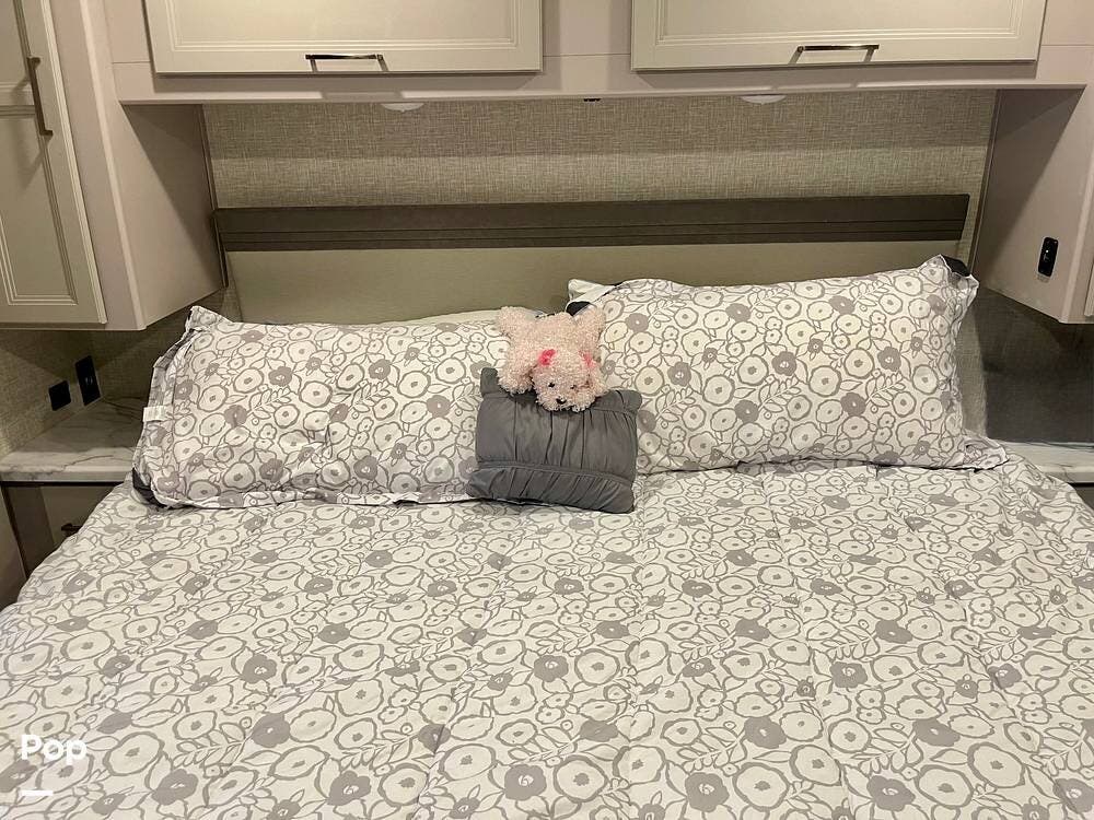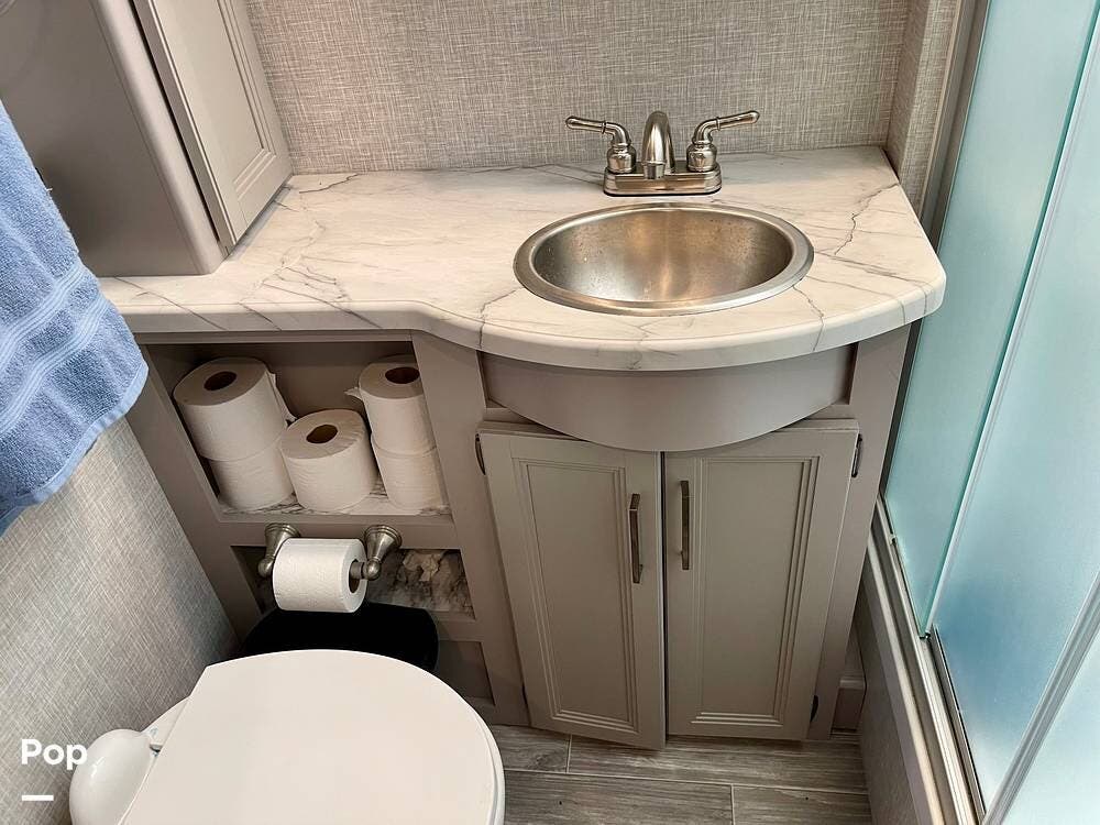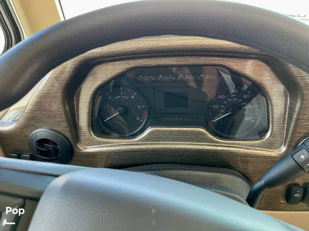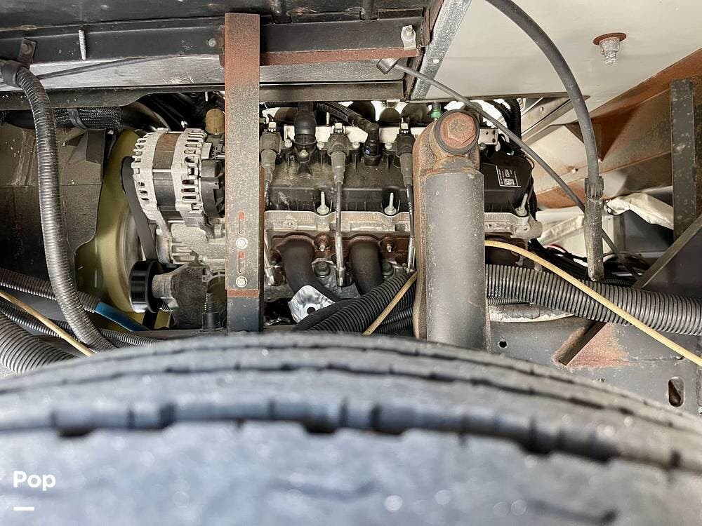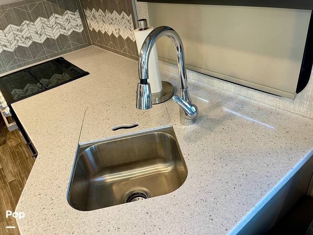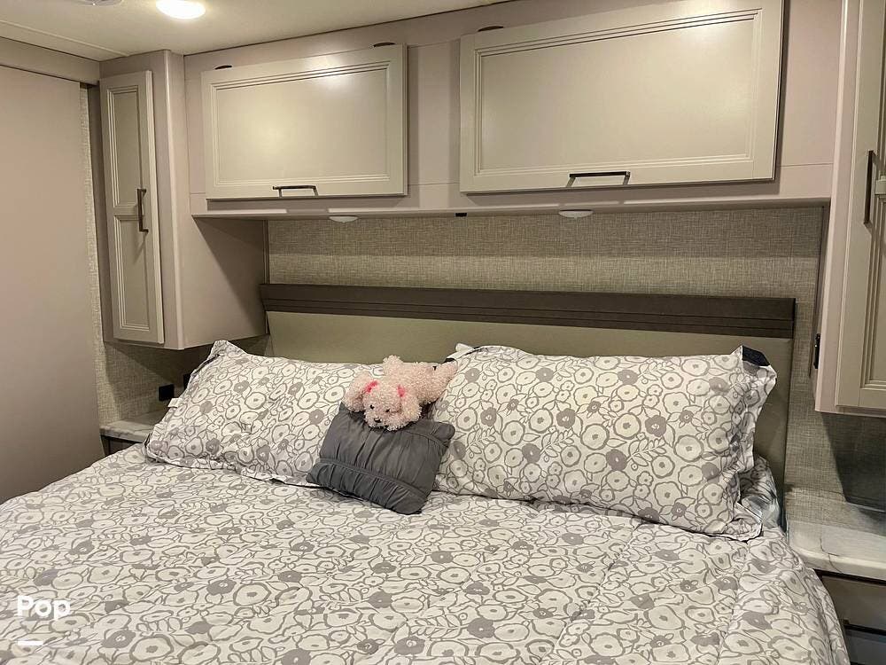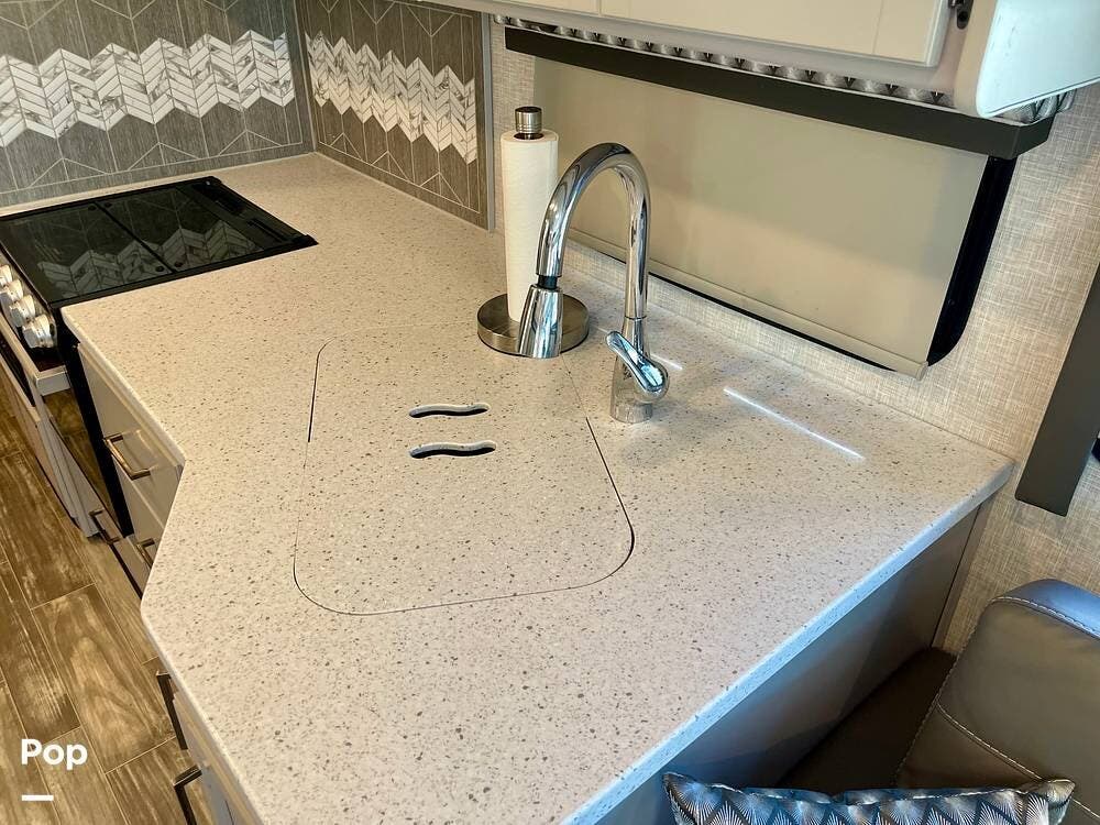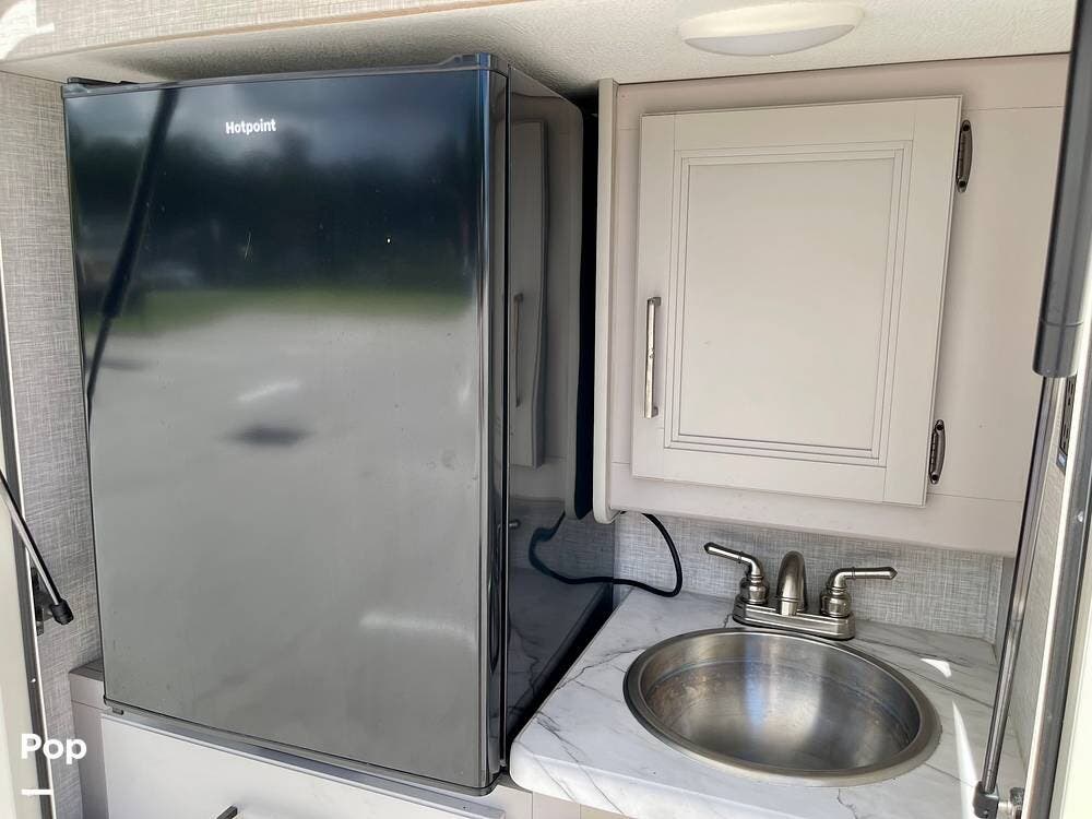 Powered by a Ford V8 engine, it delivers reliable performance whether cruising on highways or setting up at camp. Inside, the well-designed layout offers a full kitchen with solid-surface countertops, a residential refrigerator, and generous storage throughout.