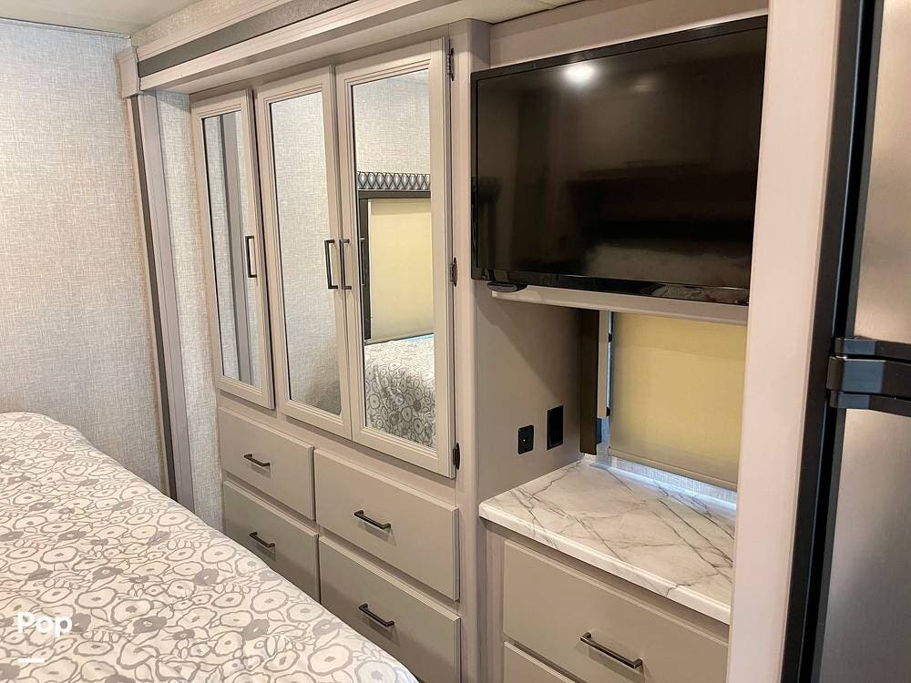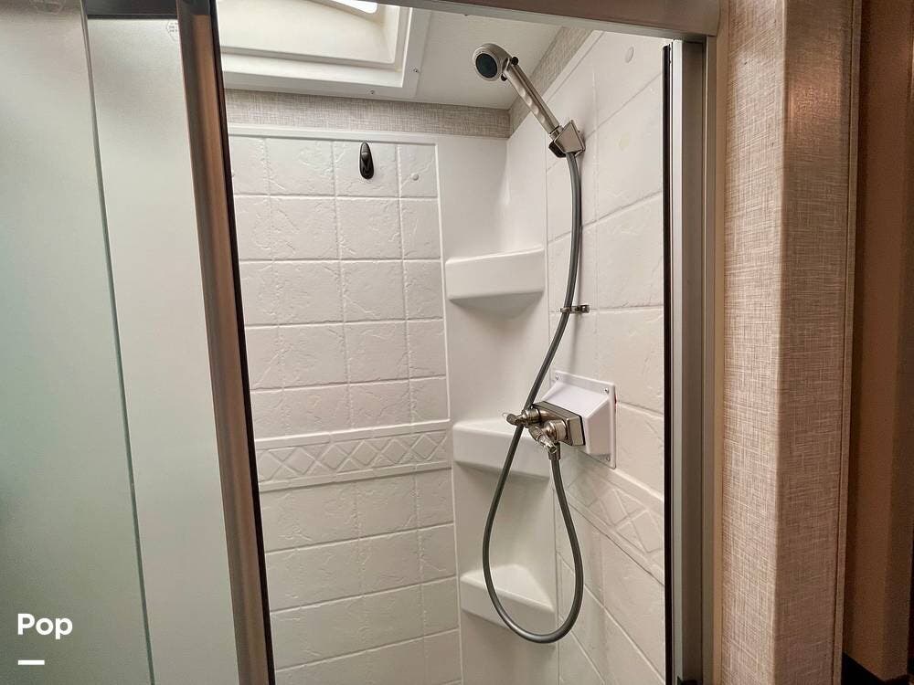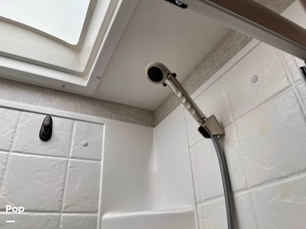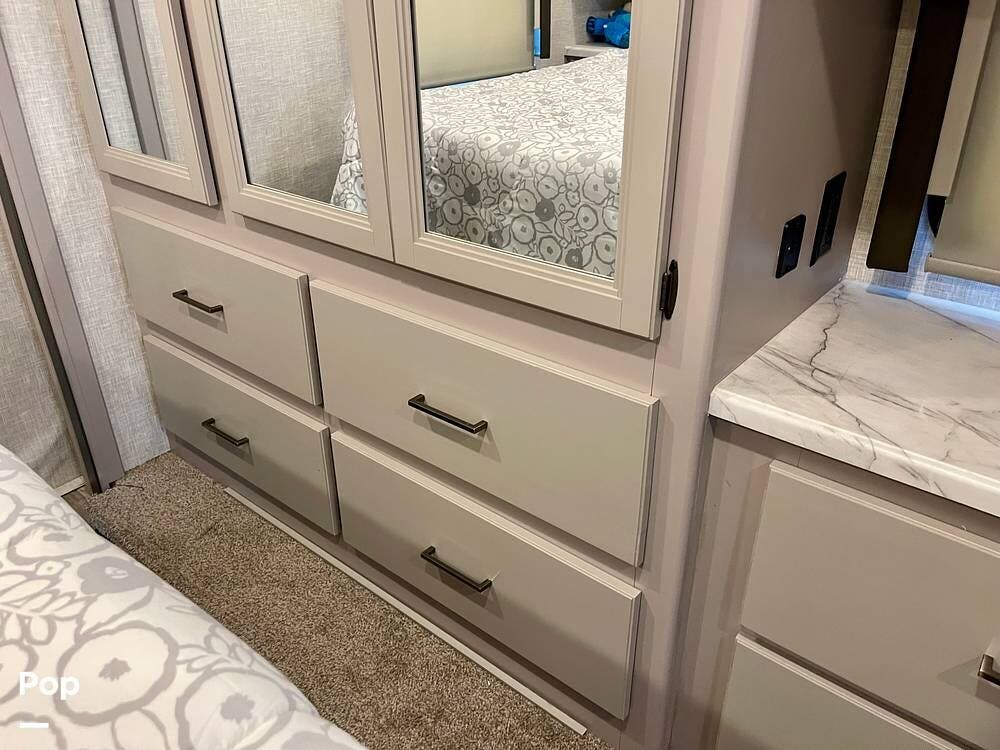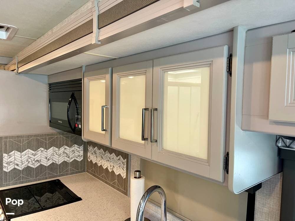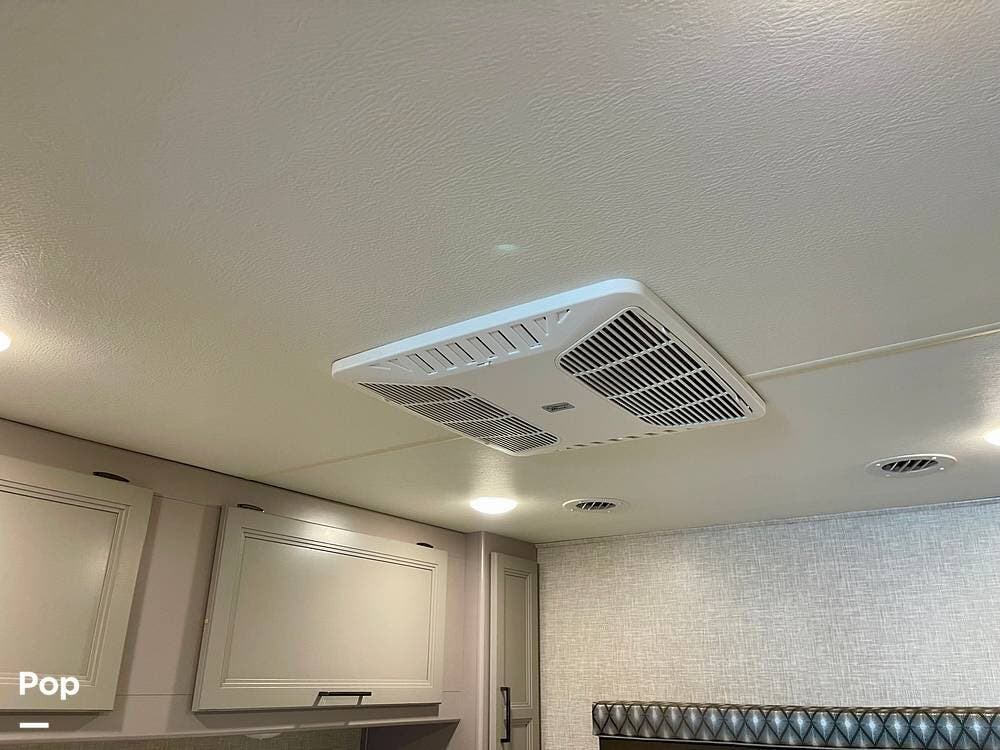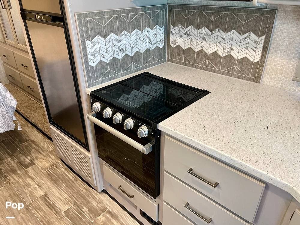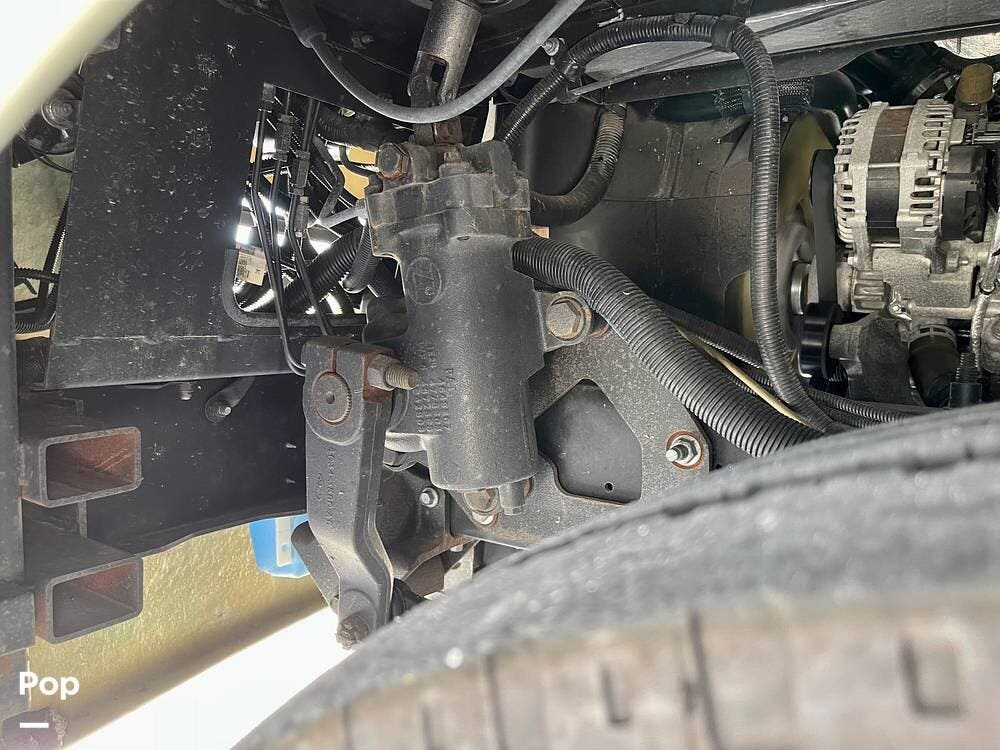 Powered by a Ford V8 engine, it delivers reliable performance whether cruising on highways or setting up at camp. Inside, the well-designed layout offers a full kitchen with solid-surface countertops, a residential refrigerator, and generous storage throughout.