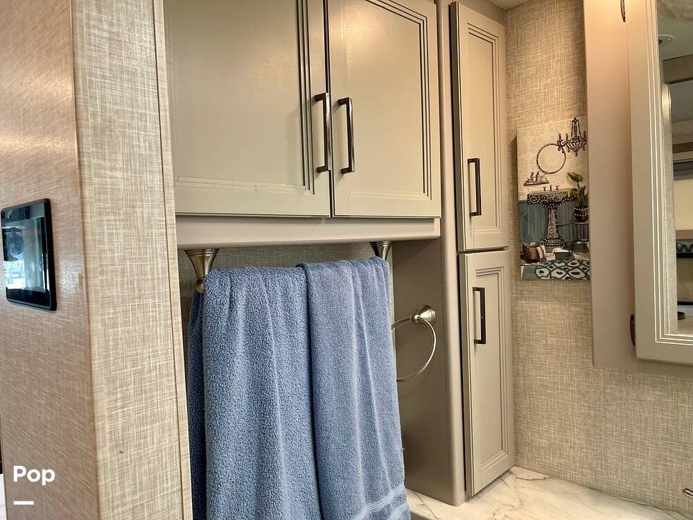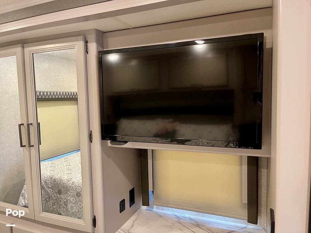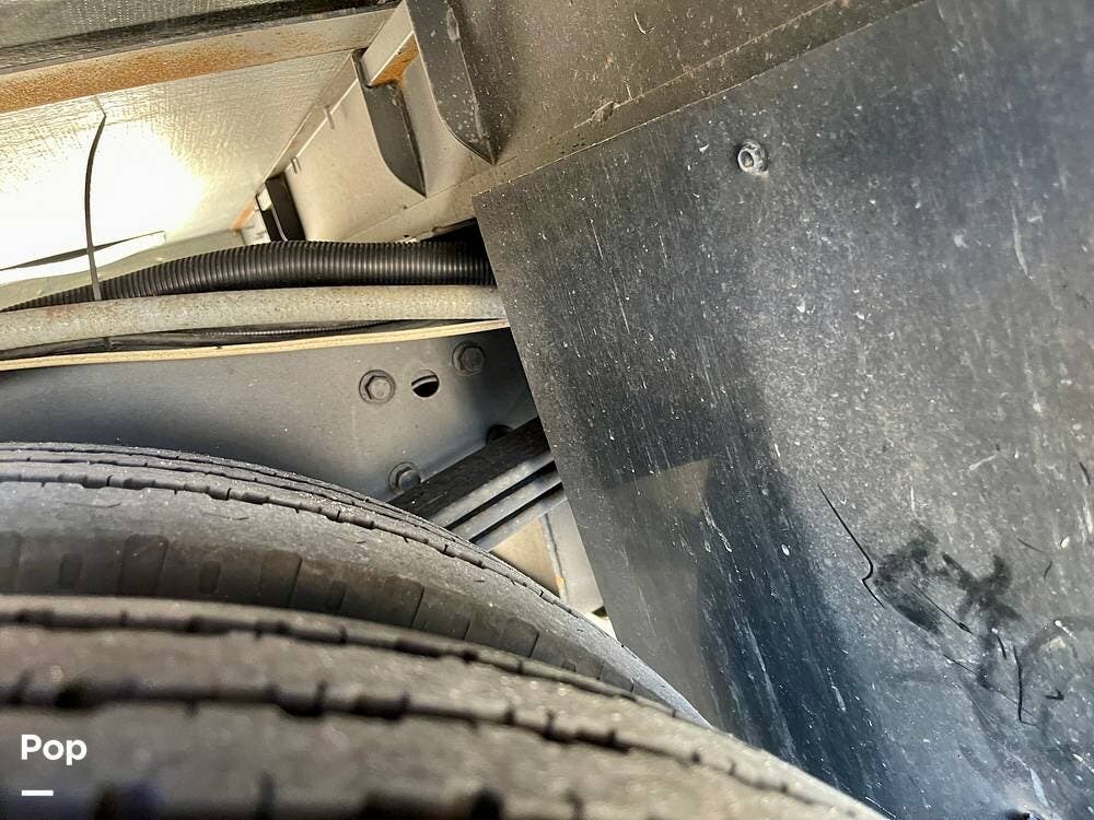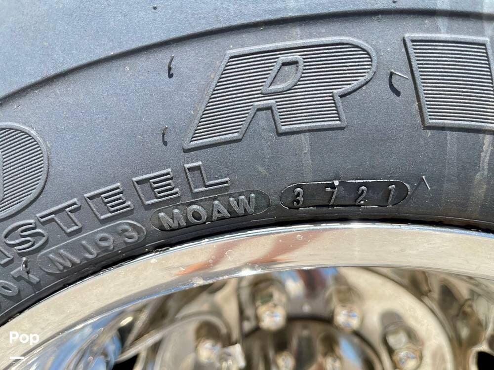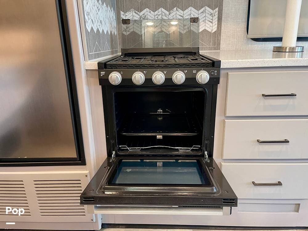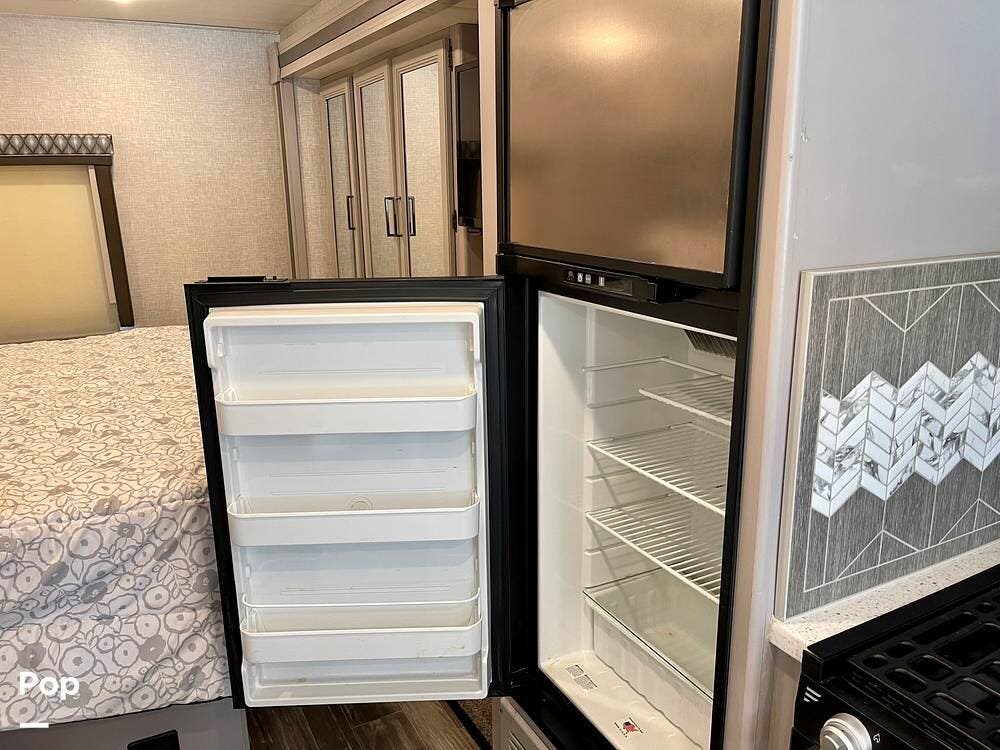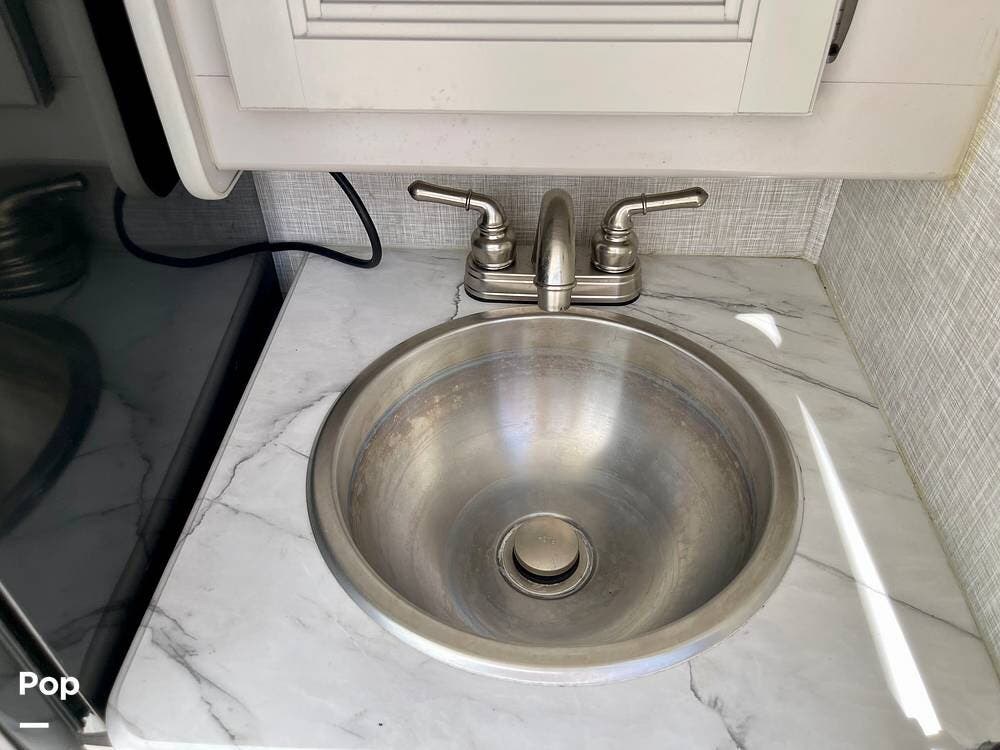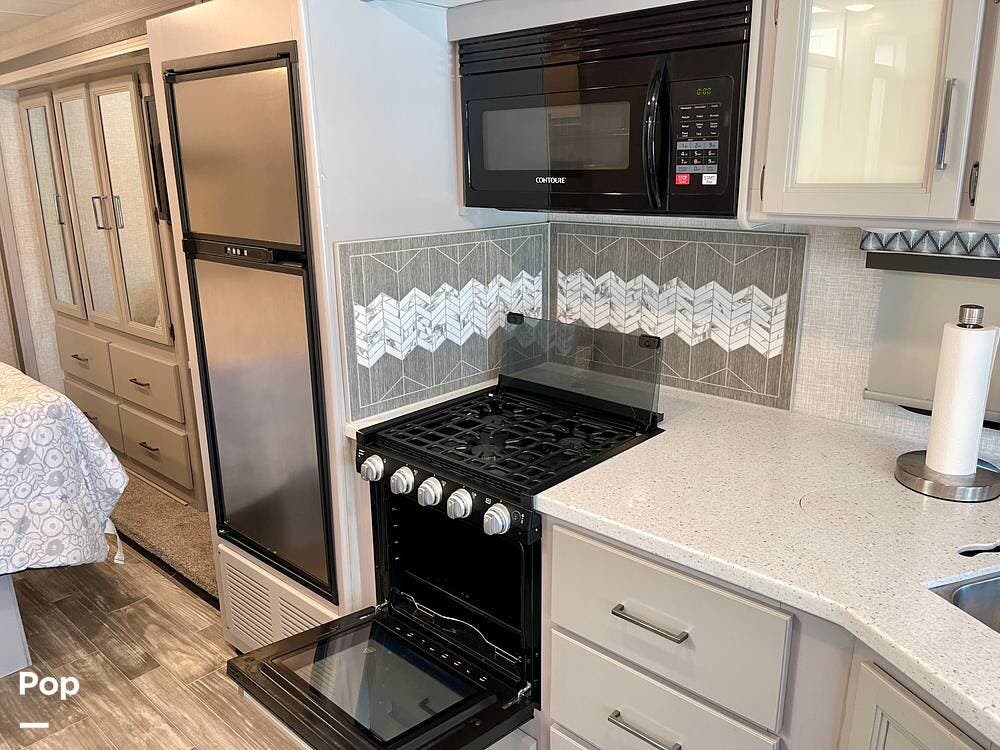Powered by a Ford V8 engine, it delivers reliable performance whether cruising on highways or setting up at camp. Inside, the well-designed layout offers a full kitchen with solid-surface countertops, a residential refrigerator, and generous storage throughout.
