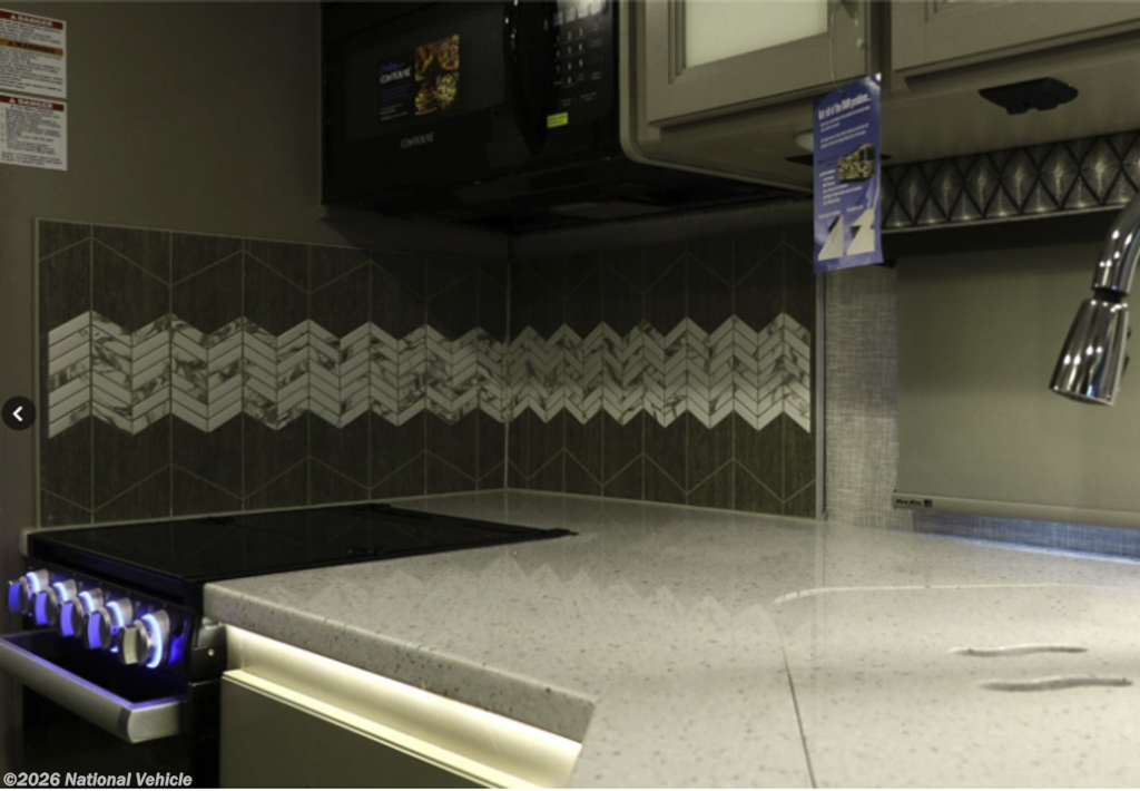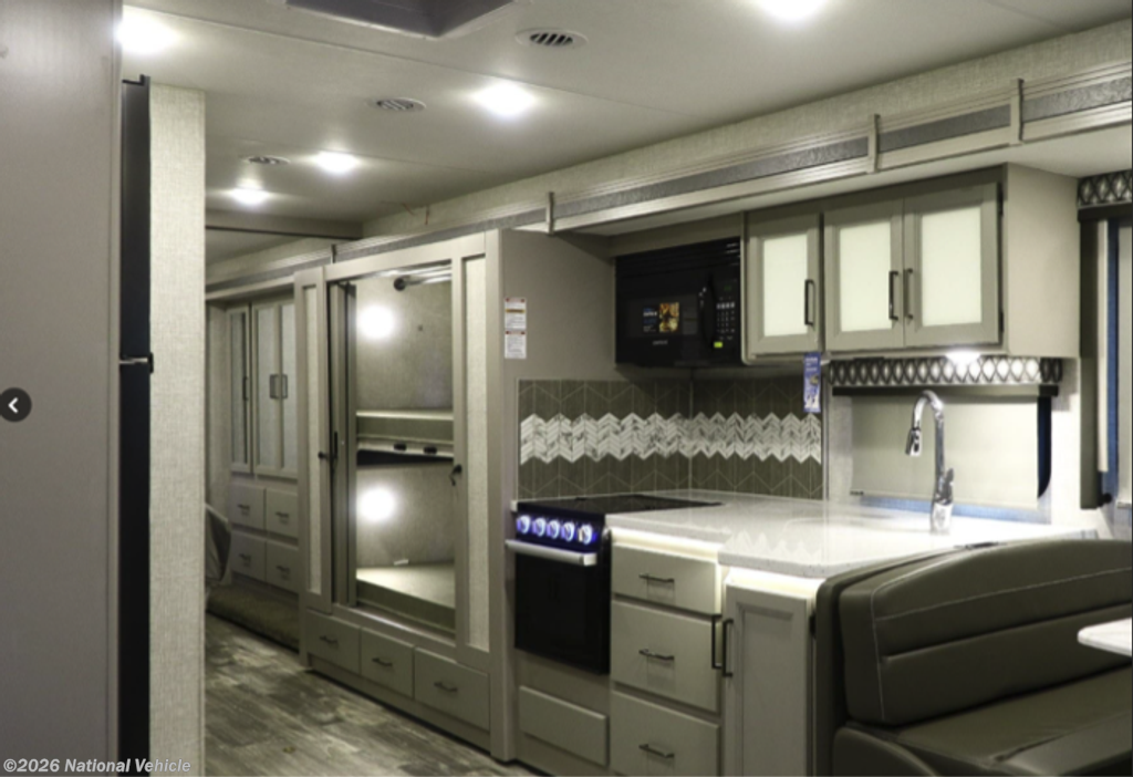 The kitchen is fully equipped for real-world use, featuring a 3-burner stove with oven, microwave, full-size refrigerator, and ample counter space and cabinetry. Whether you?re preparing quick meals or full dinners, this setup provides the functionality you need for extended travel.