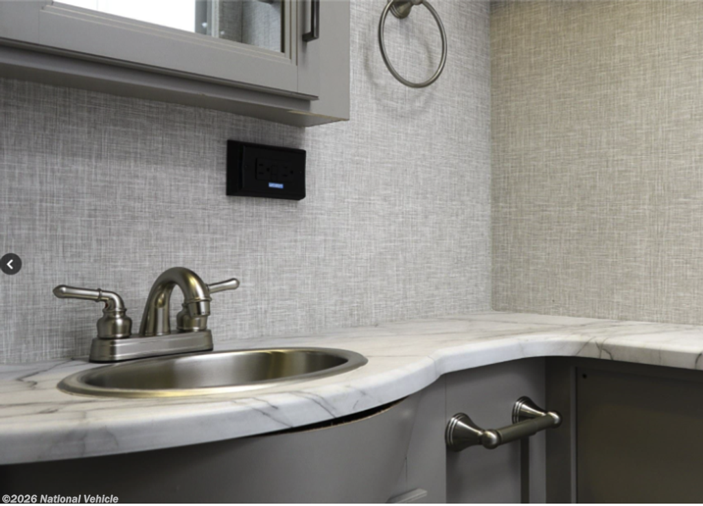 A centrally located bathroom includes a shower, porcelain toilet, vanity, and storage, providing convenience and accessibility for both the living area and bedroom. With a 50-gallon fresh water tank and generous holding capacities, this coach is well-suited for both campground stays and longer adventures.