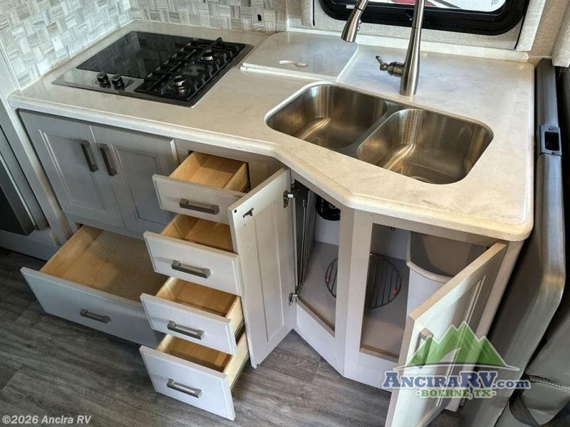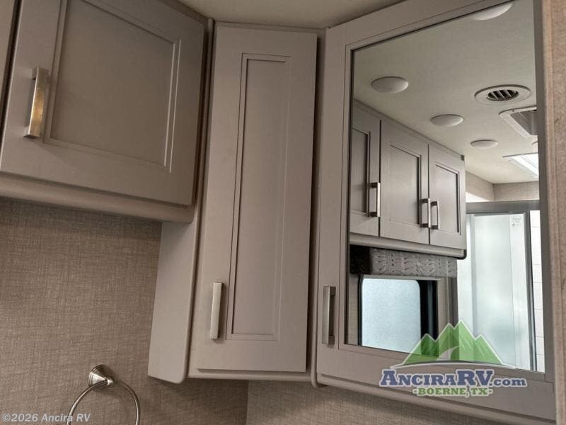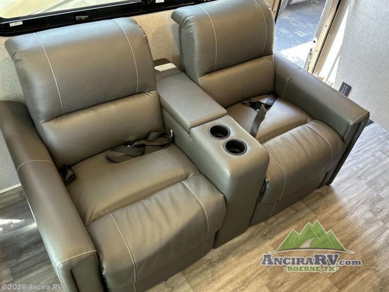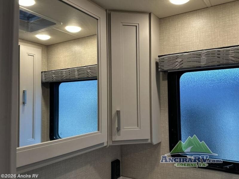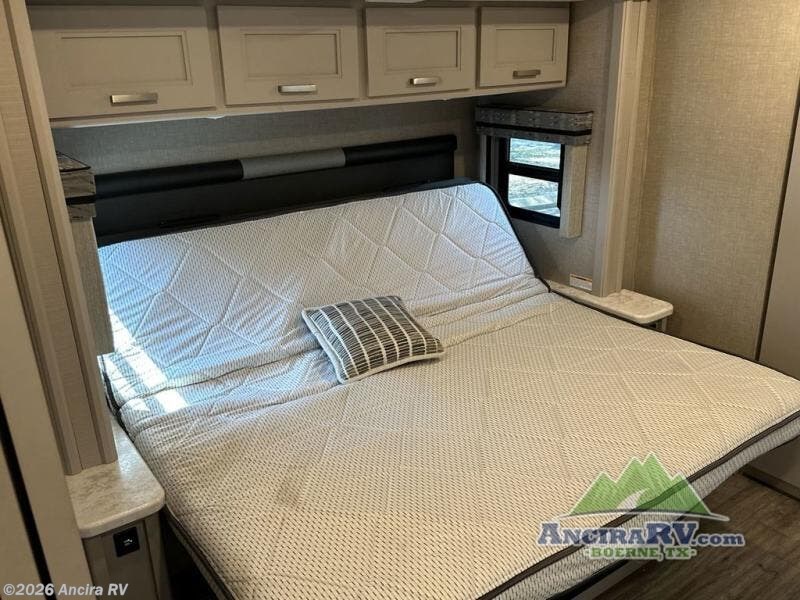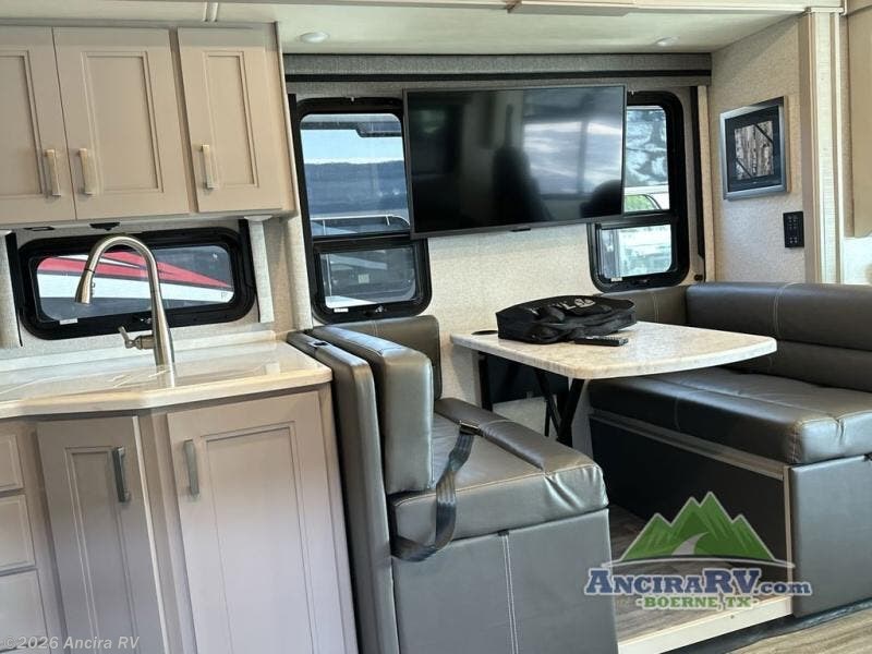 Head out on your greatest of adventures with this motorhome! You will feel right at home in the master suite with the Tilt-A-View inclining 72" x 76" king bed slide across from a closet with a dresser and a 32" TV, plus you have access to the full rear bathroom which has a 30" x 36" shower to get squeaky clean each morning. If you add the optional stackable washer and dryer to the prepped area then you can extend your trips with clean clothes. The two burner high output gas range top with a single induction cooktop will be easy to cook your favorite meals on and the 72" Dream Dinette offers a comfortable place to enjoy them. The drop-down 52" x 74" bunk over cab can not only be used for sleeping, but also for storage space. You also have a 68" jackknife sofa to read a book on during the day and transform into an extra sleeping space at night or you can switch it out for the optional theater seating!