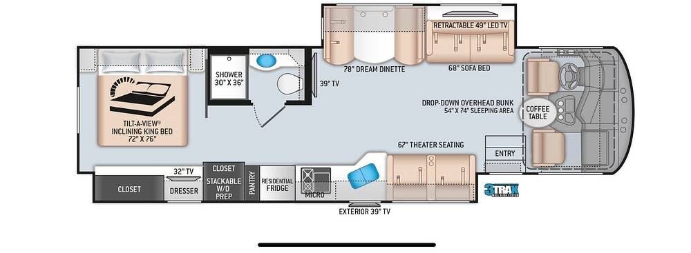 Stepping inside the Miramar, you'll find ample room for entertaining and plenty of seating, including a pullout sleeper sofa, two theater-style recliners, and passenger and driver seats that swivel around to join in the conversation. The room also features an in-wall TV, a drop-down bed, and an additional TV for viewing from the bed.
