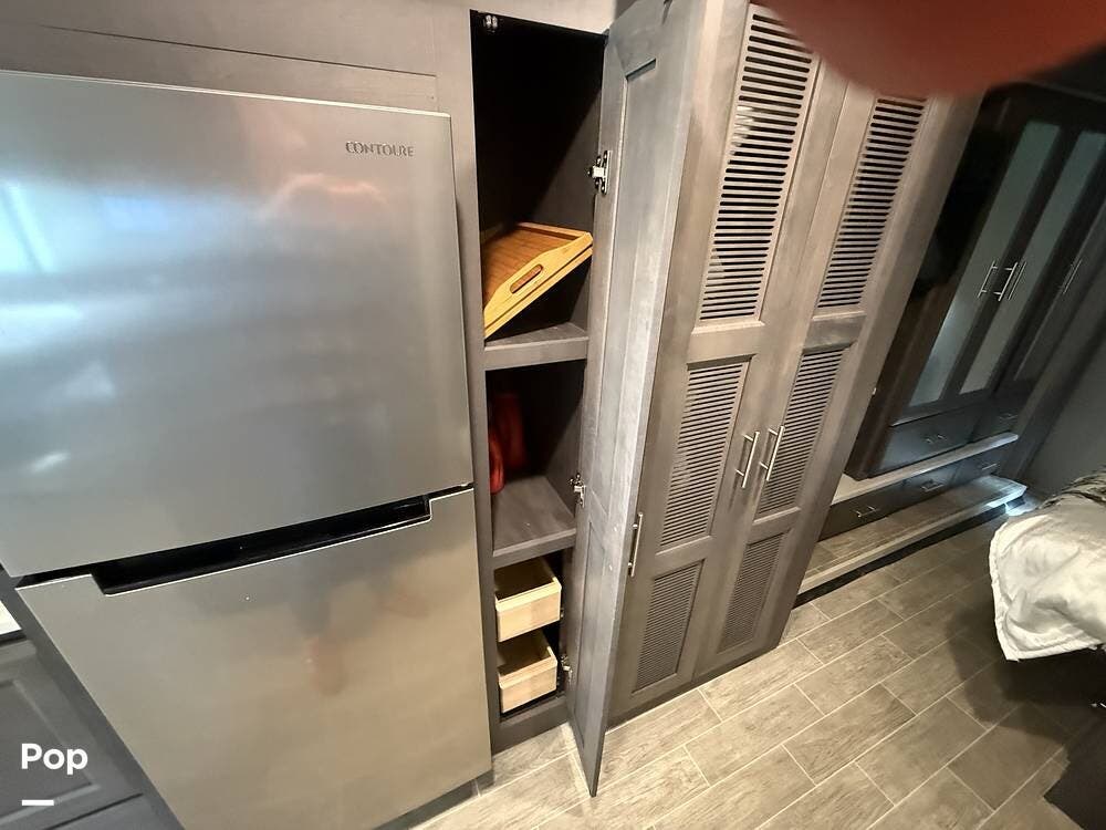 The kitchen features a convection microwave, stovetop, residential-size refrigerator, sleeper dinette, ample drawers, and a pantry for storage.