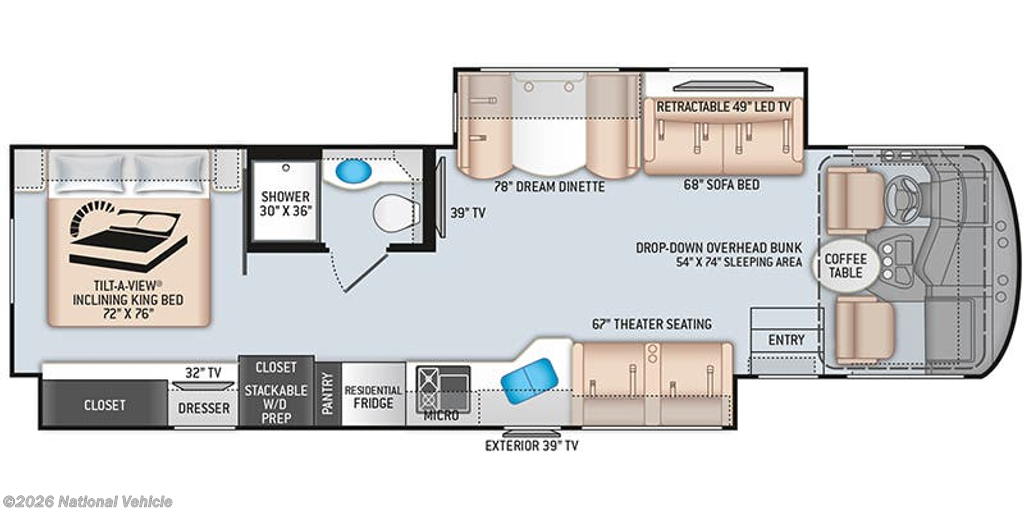 Theatre seating, dinette-bed, sofa-bed, a drop-down overhead bunk, and a King Tilt-A-View bed in the master bedroom offer flexible and comfortable sleeping arrangements.