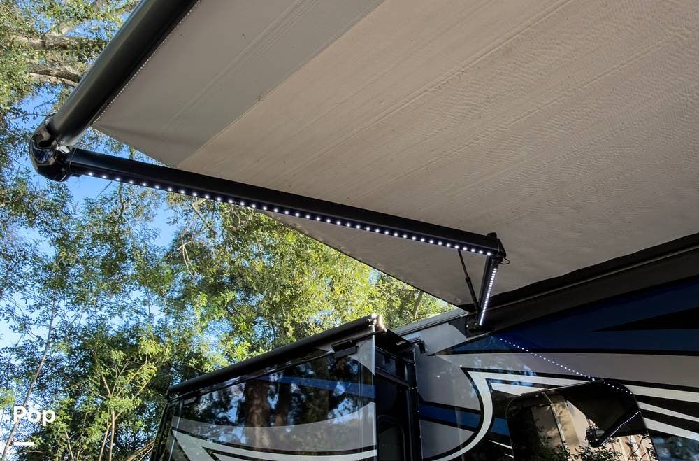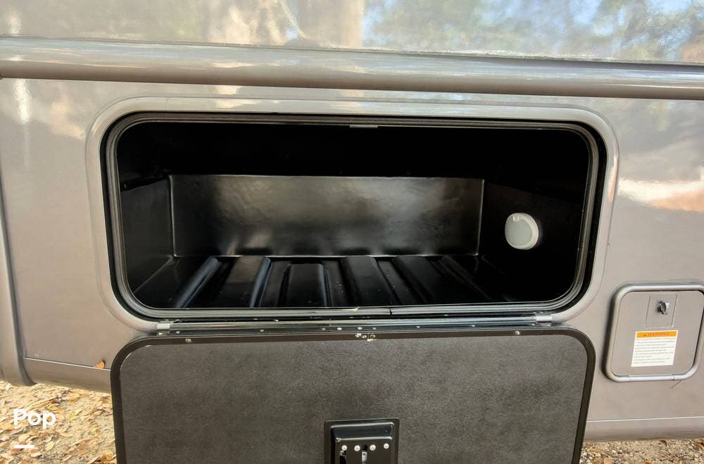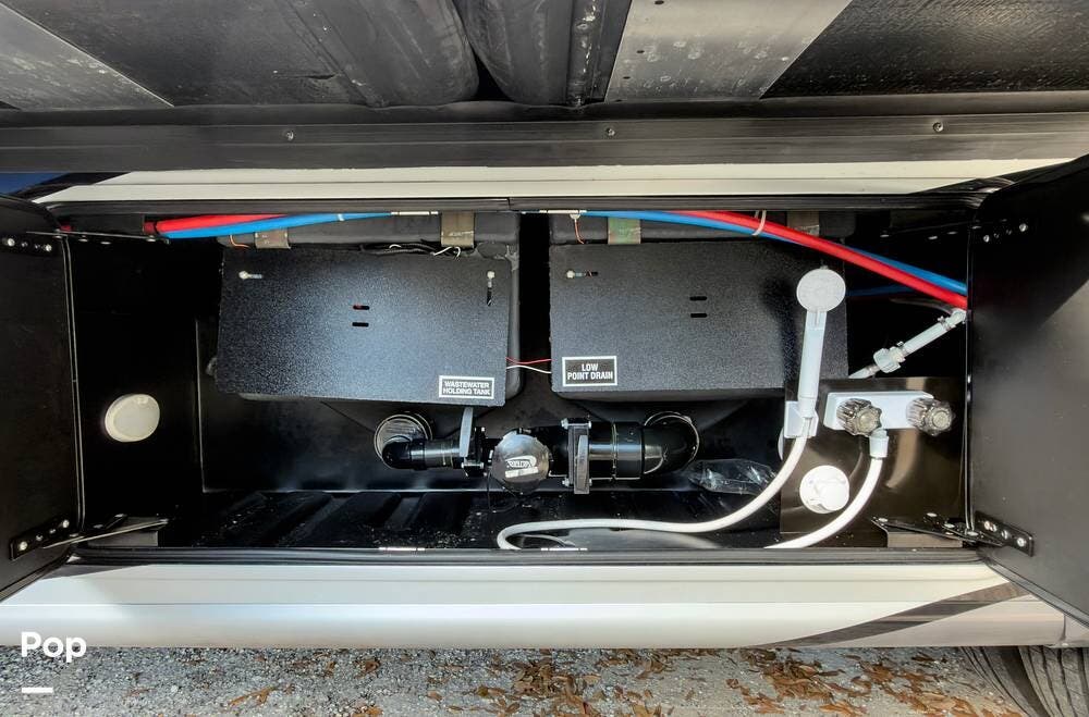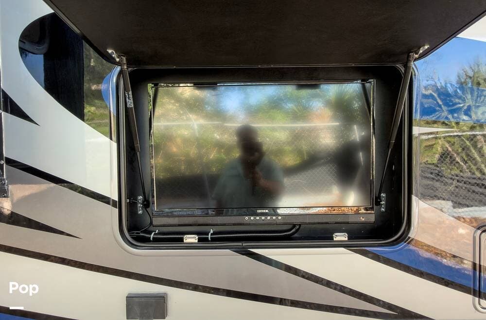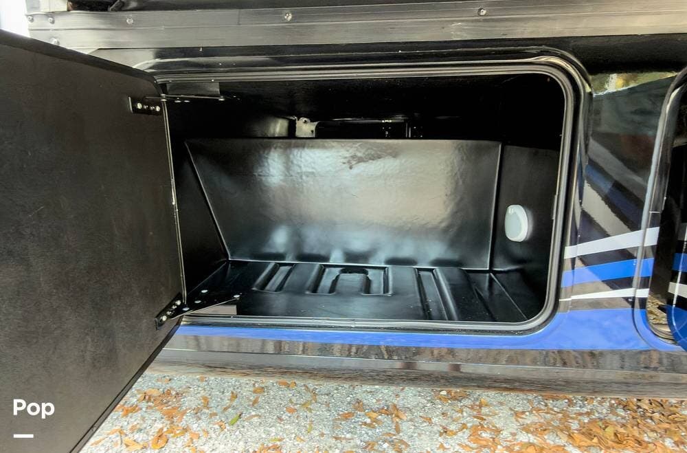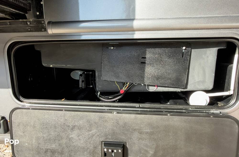 The exterior is the Lake Powell full body paint that is very glossy, and it's sitting on aluminum wheels. Tons of storage underneath, plus outdoor lighting and entertainment( exterior TV).