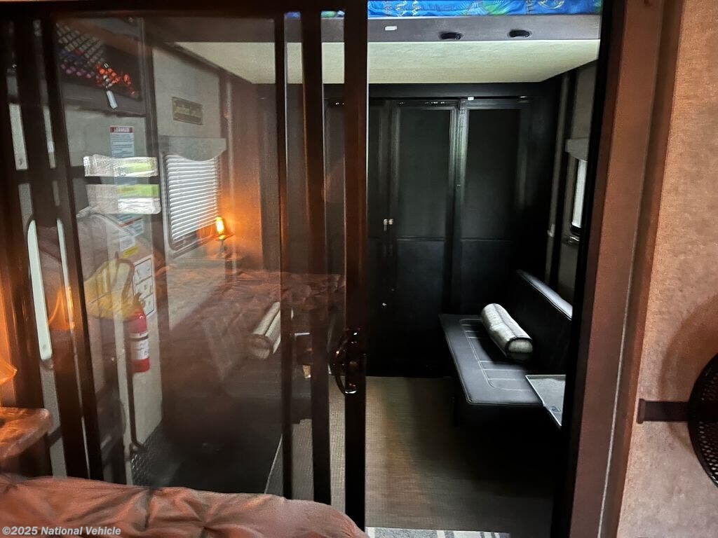 Inside, you?ll find a front living area with a large TV, sofa bed, and a dinette; the kitchen includes a refrigerator, convection microwave, and full cabinetry for serious meal prep. The private bedroom has a queen bed slide?out and generous storage, while the garage area includes a drop?down bunk and a patio deck that turns the ramp into a usable outdoor space.