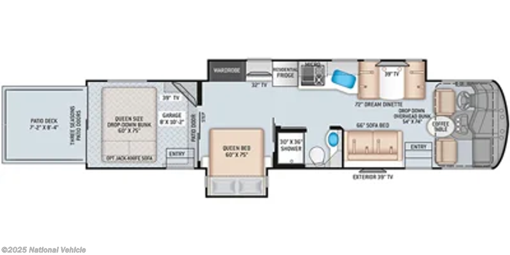 With two slide?outs, dual power awnings, high holding tank capacities (fresh, gray, and black), a robust generator, and a huge fuel tank, the 38MB is built to take you far. Extras like exterior TVs, a tankless water heater, and solid insulation make this coach a great choice for extended adventures?whether you?re chasing sunrise or carrying serious gear.