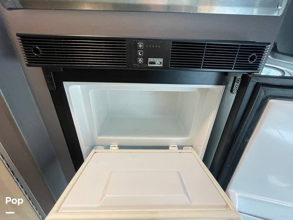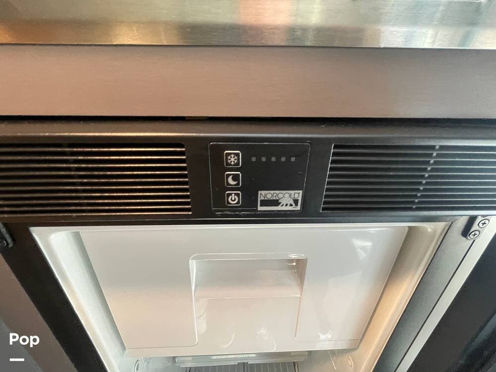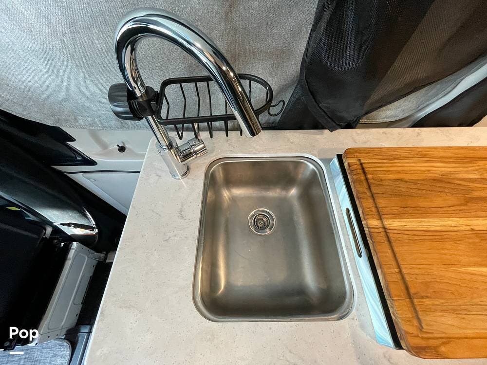 The Sanctuary comes with a complete kitchen, featuring a microwave and a stainless-steel electric refrigerator located behind the driver's seat. On the opposite side is a stainless-steel single-bowl sink with cover and a two-burner gas cooktop.