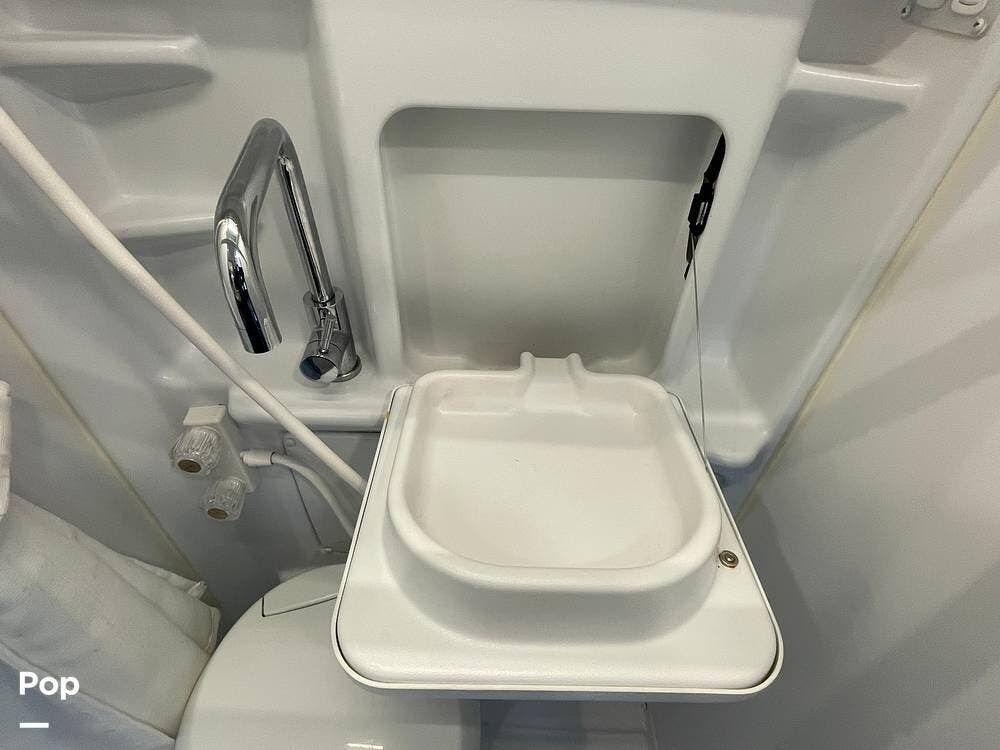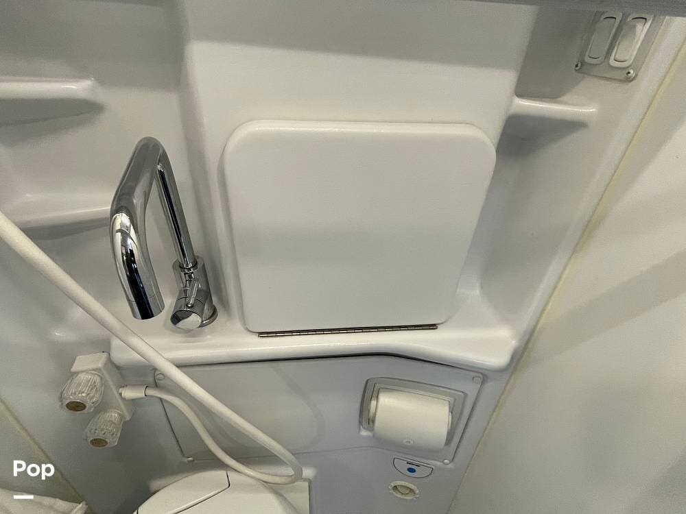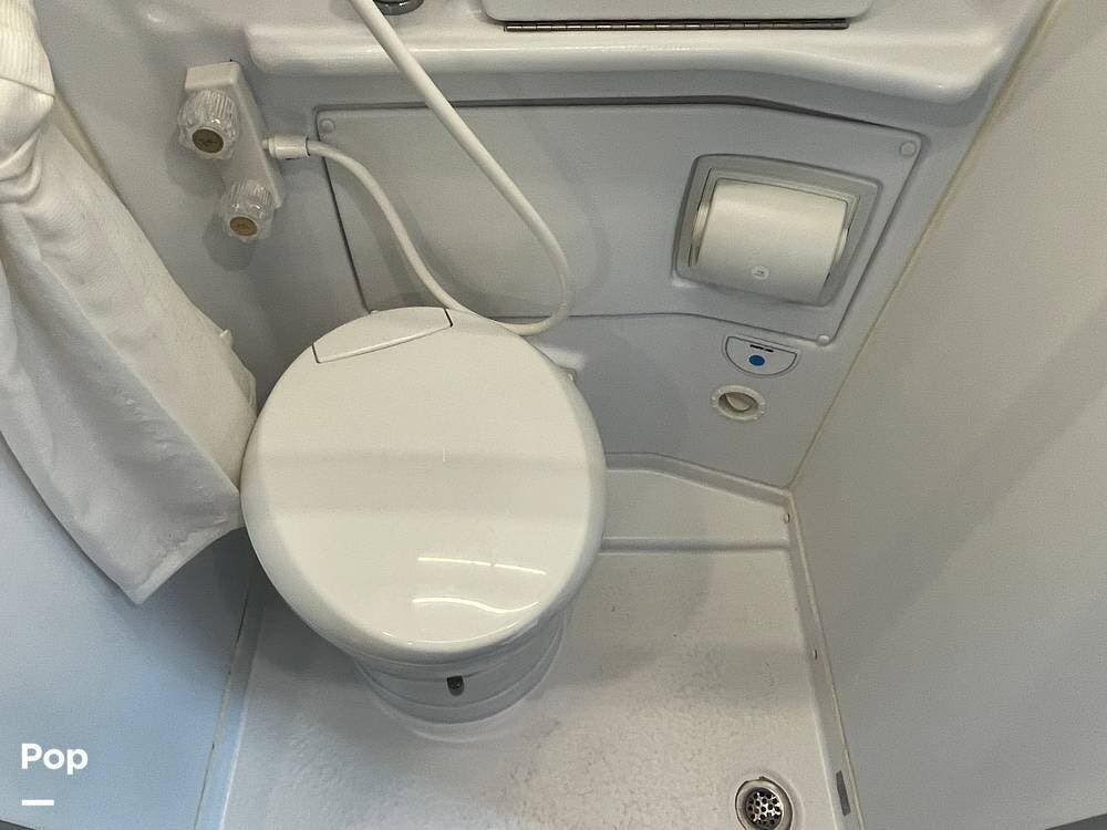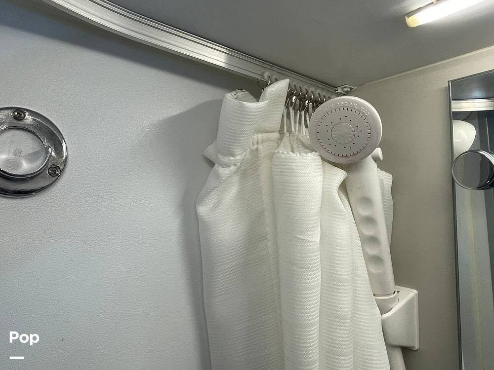 The wet-bath area features a cassette toilet, a shower wand, a fold-down sink, and a power bath vent.