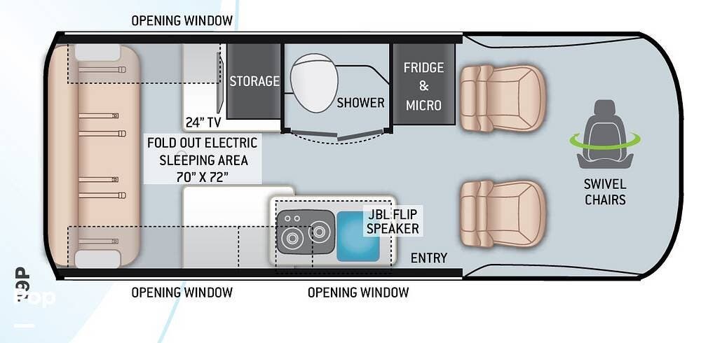 The 19P has been upgraded with the Re(Li)able Power Pack Electric system (11,000 kW lithium batteries, 3000-watt Pure-Sine Inverter, solar panel, and 280-amp alternator) that replaces the standard 2500 LP generator, which is great for boondocking.