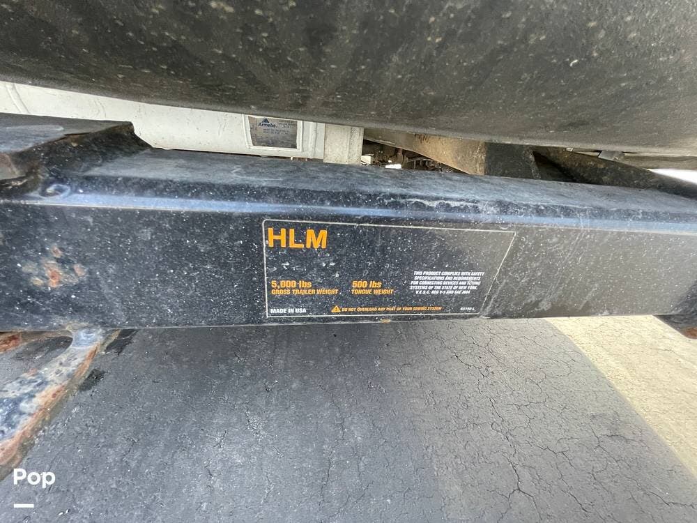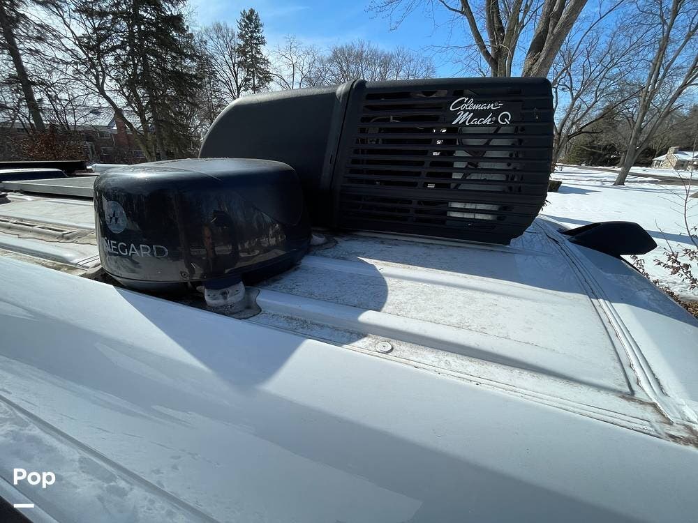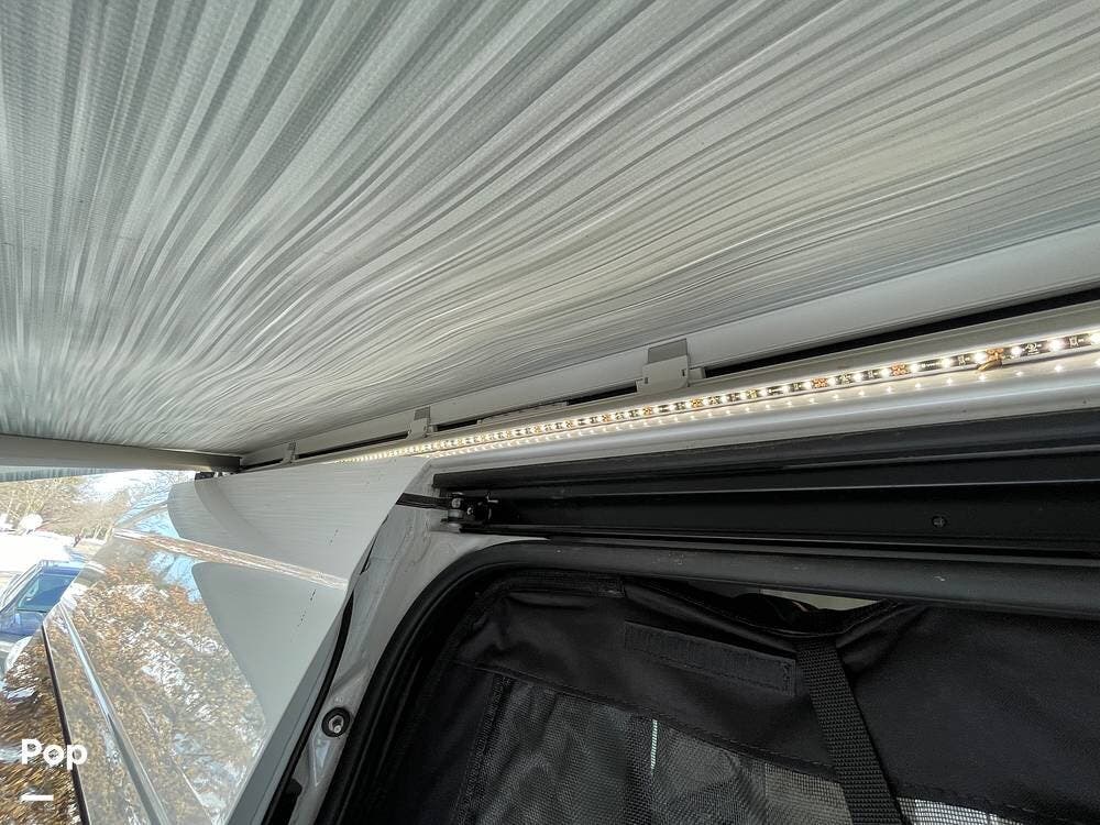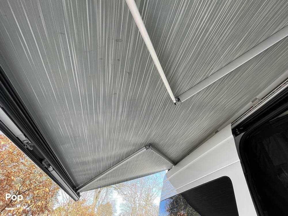 The exterior features a roof ladder, roof rack system, and bike rack. There is also a screen door for the side slide entry and a lateral arm power patio awning with integrated LED lighting.