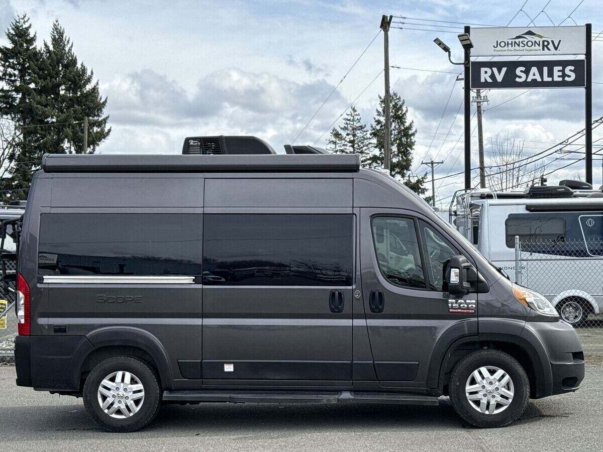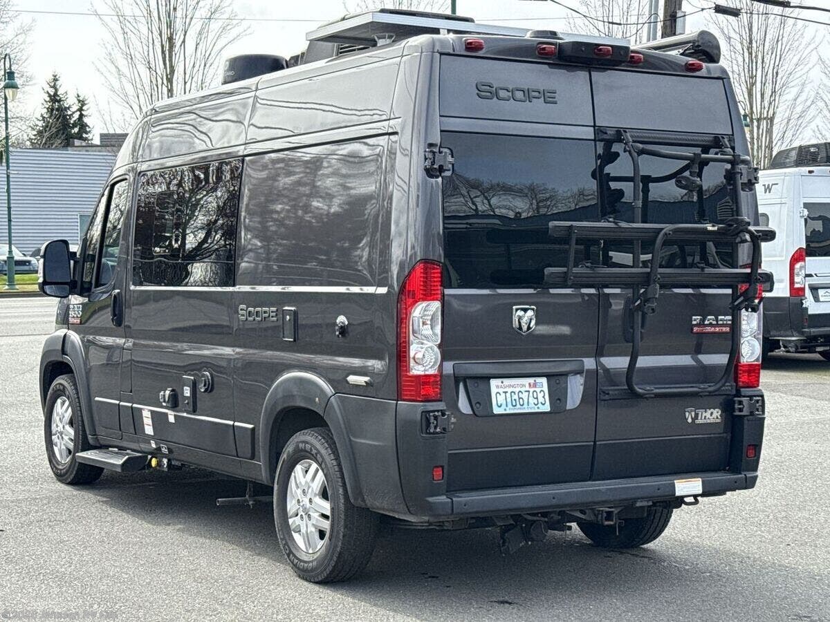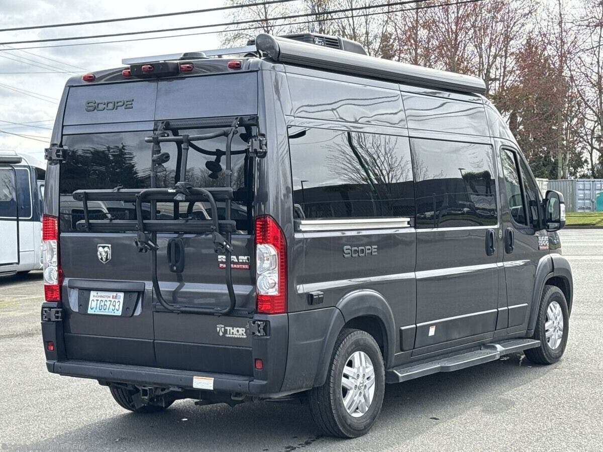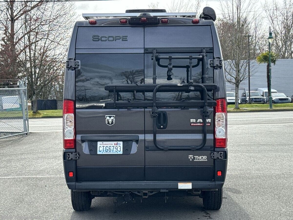 The 2022 Thor Motor Coach Scope is a versatile and compact RV that's perfect for both adventurous road trips and comfortable camping experiences. With just 16,877 miles on its odometer, this Class B motorhome is ready for new adventures. Built on the robust Ram ProMaster 1500 XT Chassis, this Scope is powered by a 3.6L V6 gas engine that delivers 280 horsepower and 260 lb-ft of torque. This powerful engine ensures you have the strength and durability needed for your travels. Its exterior features aluminum wheels and a 3500-pound hitch with a 4-pin connector, making it easy to bring along additional equipment or a small trailer. Plus, the rear door Thule bike rack is perfect for cycling enthusiasts looking to explore new destinations. **Cab Features:** - Cab side steps for easier access - Keyless entry system for convenience - Power door locks and windows - Windshield privacy shades - Leatherette swivel captains chairs - Driver and passenger airbags for safety - Power heated side-mirrors - 7-inch dash touchscreen with back-up monitor - Telescoping leather steering wheel with audio controls - Connectivity with Apple CarPlay and Android Auto - Cruise control for comfortable long-distance driving **Living Spaces:** - Power awning to enjoy outdoors in comfort - Easy entry with side steps and sliding side door - Sliding entry door screen to keep insects out - Vinyl flooring for easy cleaning - Soft-touch vinyl ceiling and LED interior lighting - Tinted opening side windows with premium privacy roller shades - European-style cabinetry with ball-bearing drawer guides **Dining and Kitchen:** - Removable table for flexible dining arrangements - Pressed countertops with an undermount stainless steel sink - Sink cover for added workspace - Refrigerator and gas cooktop with a glass cover - Over-cooktop task lighting and microwave oven - 12V kitchen vent switch and outdoor LP connection for grilling **Electronics:** - Systems center with Rapid Camp+ Multiplex control - HDMI cable and USB ports for electronics - Winegard Connect 2.0 with 4G WiFi and digital TV antenna - Satellite-ready and TV preparation for entertainment options - Articulating tablet holder for convenient device use **Sleeping and Bath:** - Pullout bed for a cozy sleeping experience - Wet bath design with pocket doors, shower, and cassette toilet for onboard convenience **Mechanical Features:** - Battery disconnect switch - 190W solar panel and controller for off-grid capabilities - Two Group 31 AGM batteries and Onan RV QG 2800 gas generator - Automatic transfer switch and 1000-watt inverter - 30-amp service cord, furnace, Truma Combi Eco Hydronic system - Roof AC for climate control - Outdoor sprayer for easy cleaning or rinsing This Thor Scope is an ideal companion for anyone seeking both comfort and capability on the road. Whether you're hitting the open road for a long trip or a weekend getaway, this RV provides the amenities and performance to make every journey enjoyable. ??