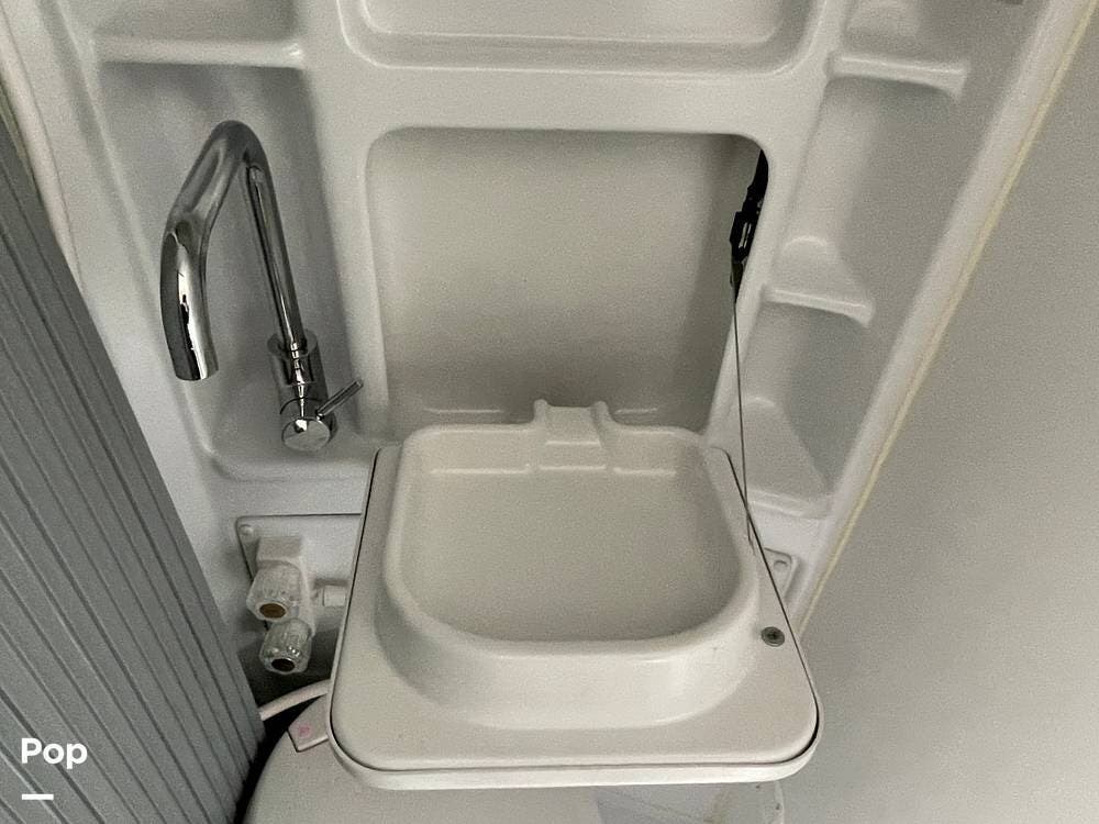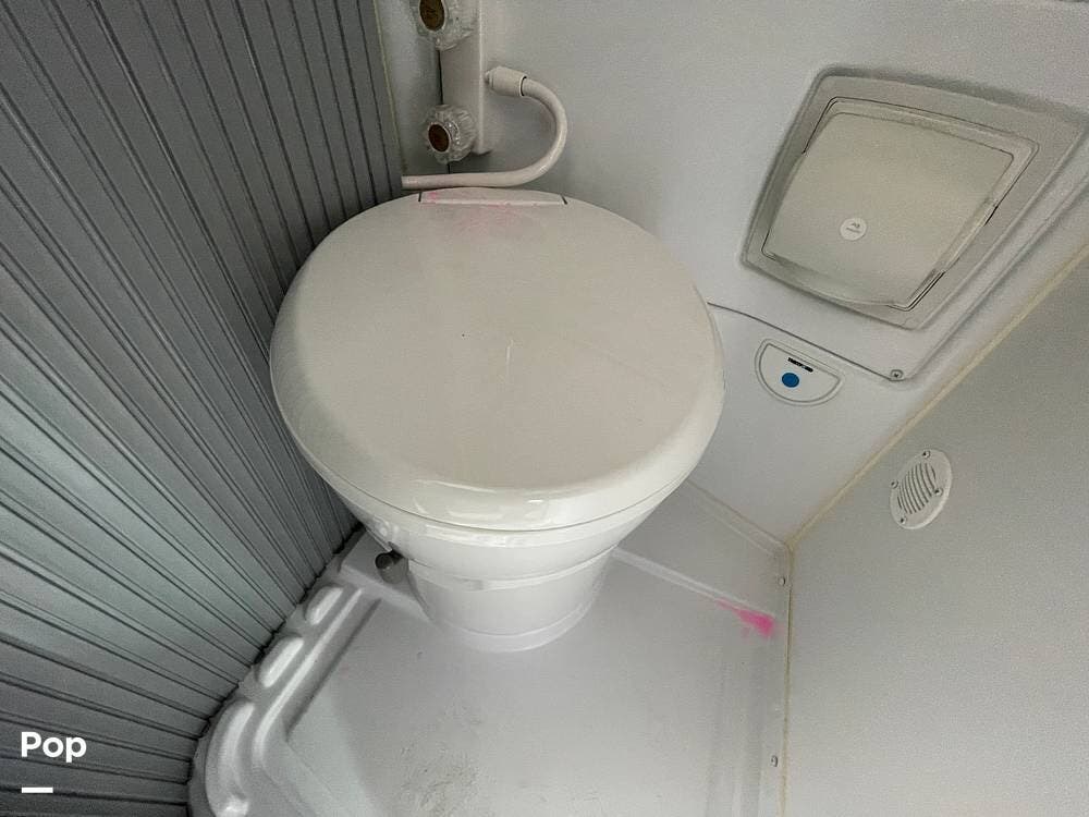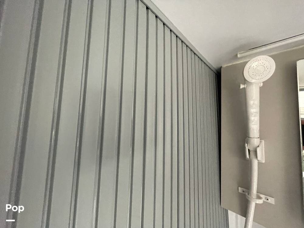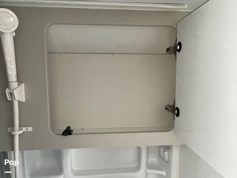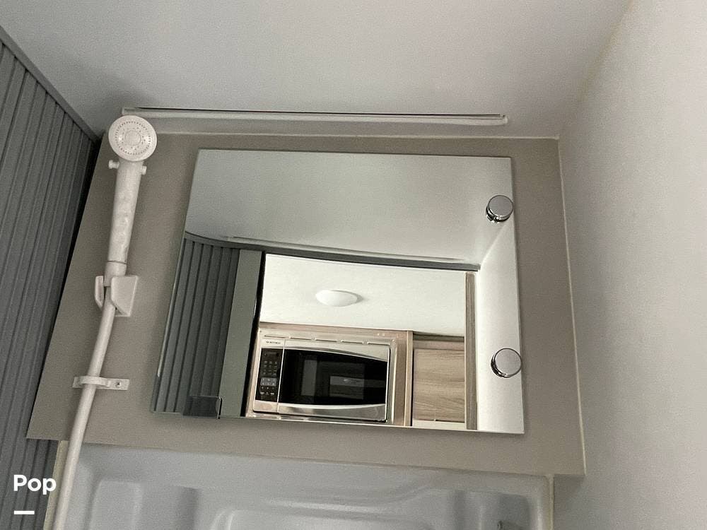 The fully enclosed wet bath features a cassette toilet, a power bath vent, a shower, a showermeiser hot-water recirculation system, a fold-down sink with a faucet, and a medicine cabinet.