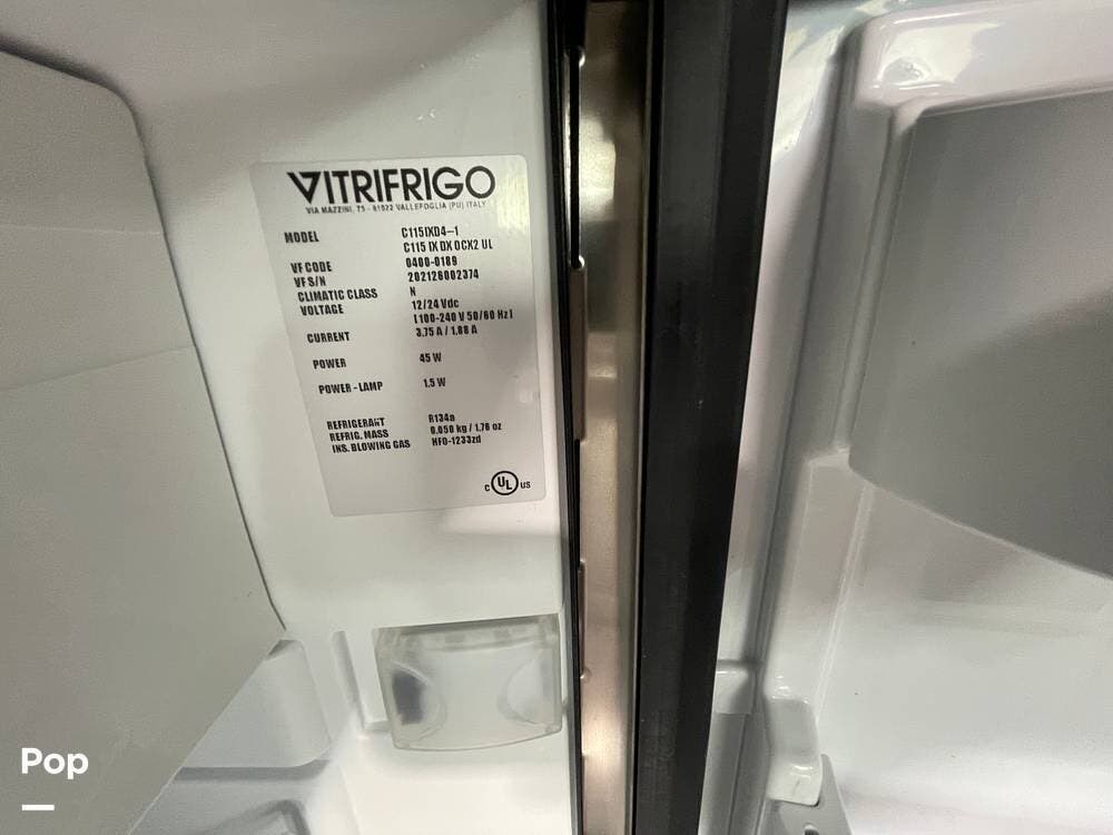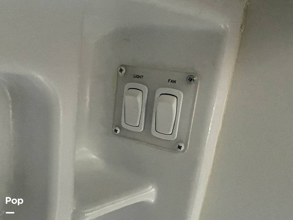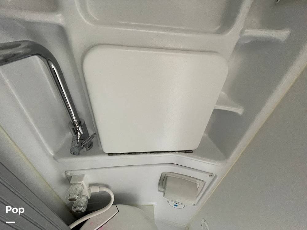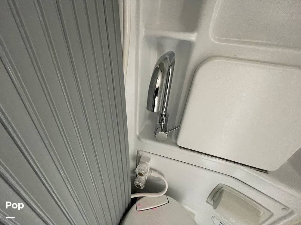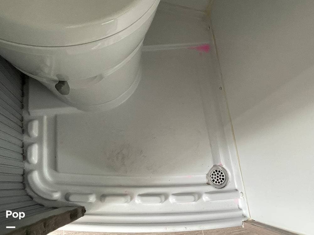 The fully enclosed wet bath features a cassette toilet, a power bath vent, a shower, a showermeiser hot-water recirculation system, a fold-down sink with a faucet, and a medicine cabinet.