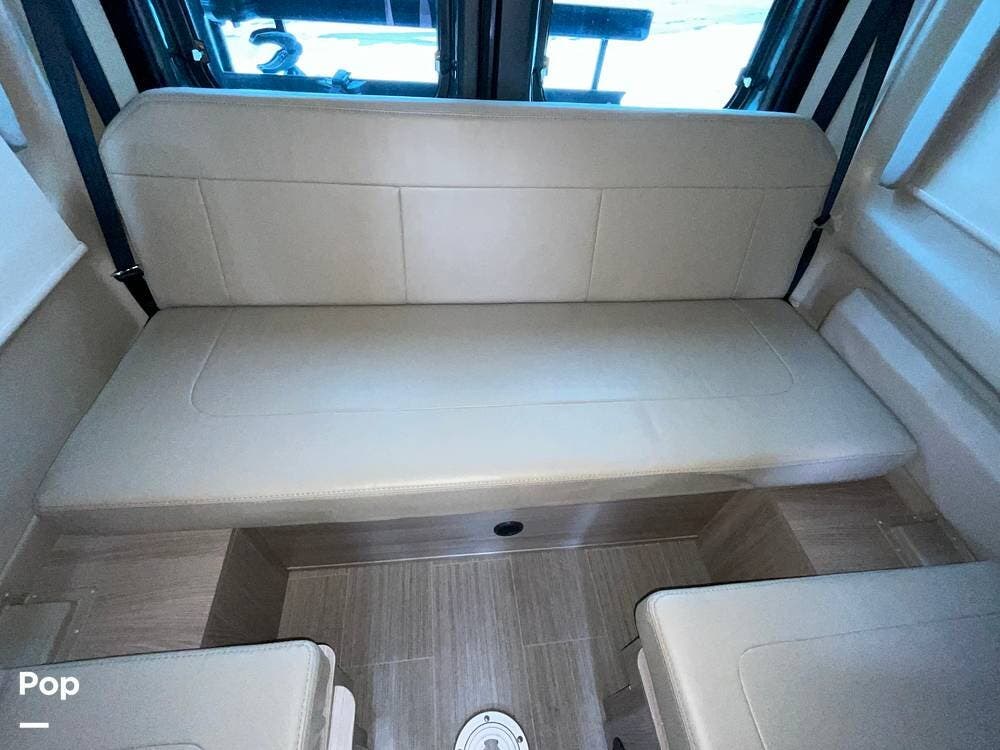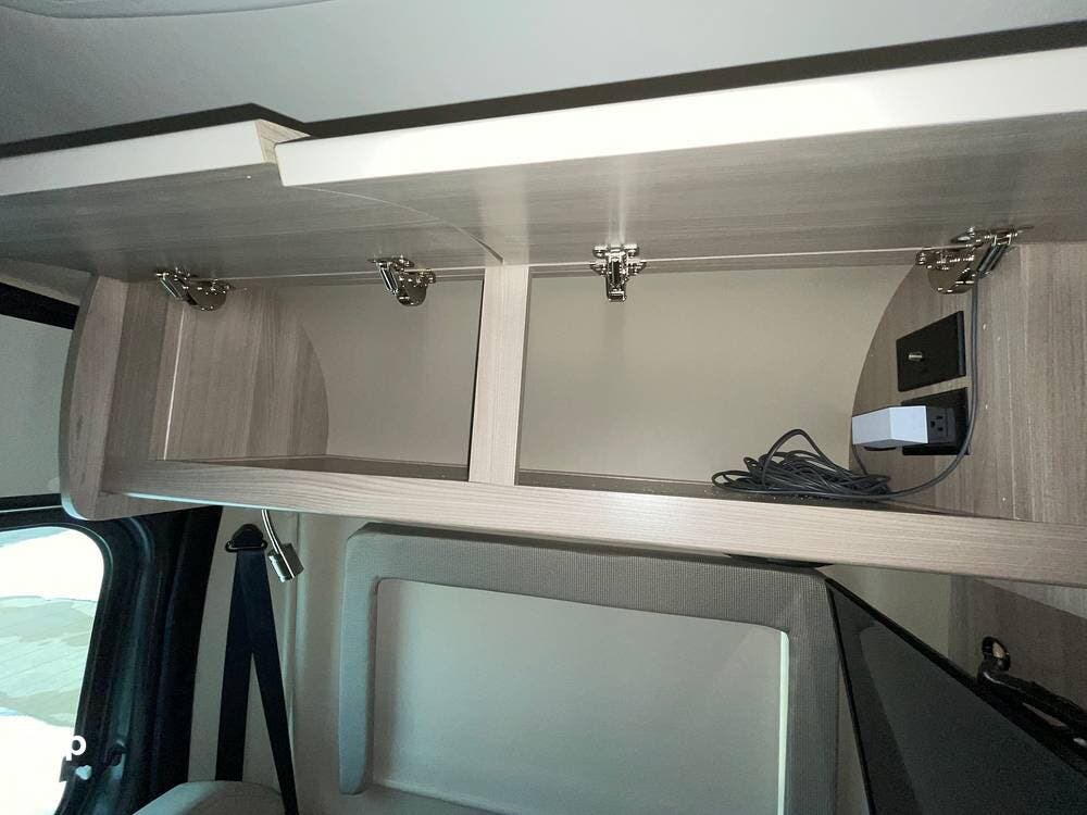 Directly behind the driver's seat is a seat with a removable table on a swing arm. There's an opening window behind the seat with storage overhead.