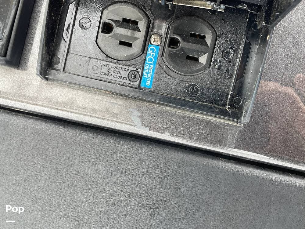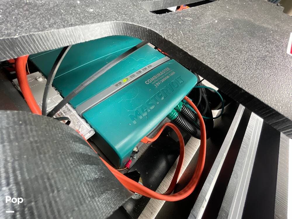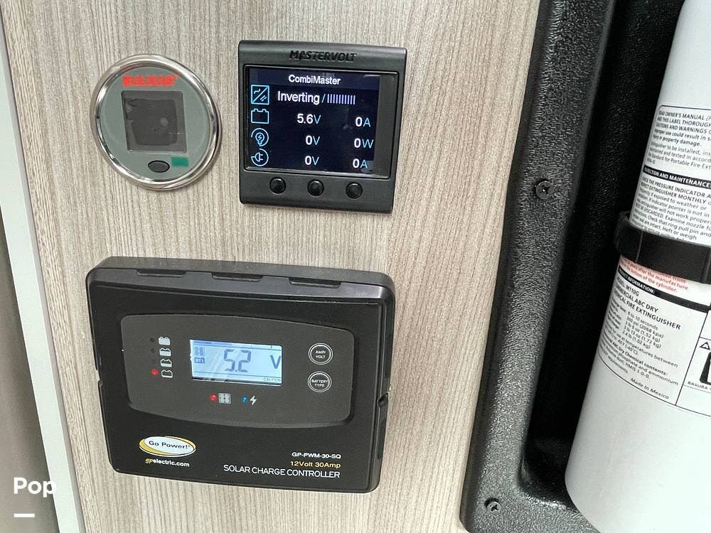 The end cap at the side entry houses a 110-v outlet, a battery switch, a fire extinguisher, a solar charge controller, and a battery monitor.