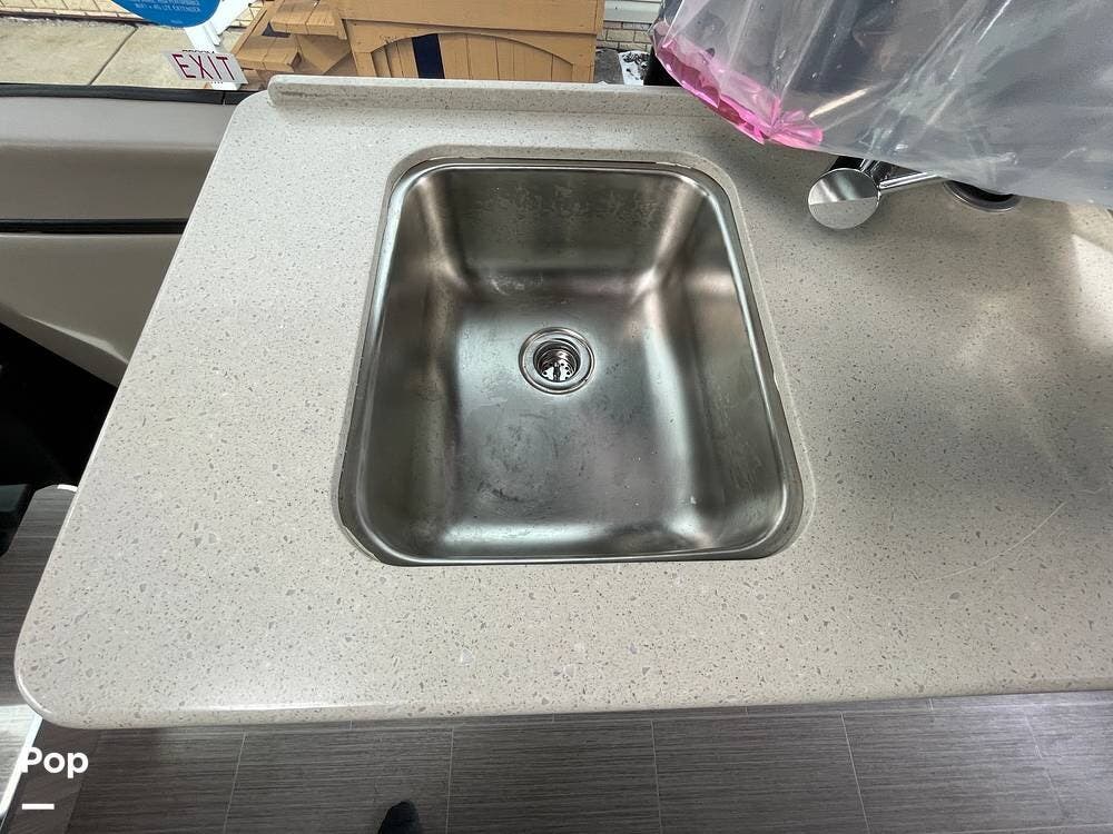 The kitchen area is found just inside the slide entry door on the driver's side.