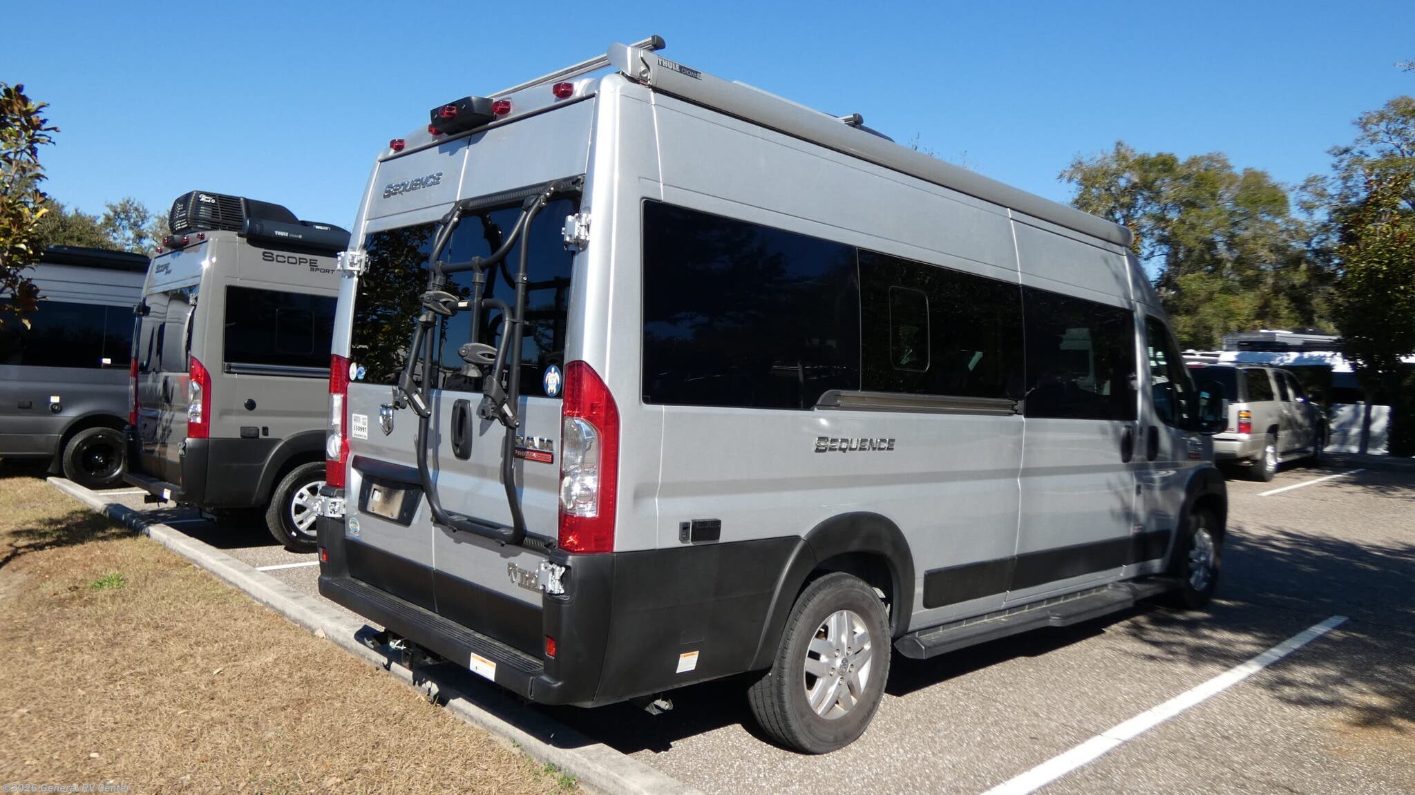 Thor Motor Coach Sequence Class B gas motorhome 20L highlights: Wet Bath Keyless Entry System Opposing Sofas Flip-Up Counter Outside Shower Travel the country with your favorite person in this motorhome! You can freshen up after a long day of traveling in the rear enclosed wet bath with a power vent fan to eliminate unwanted steam and a wardrobe with drawers to store your clothes and towels. Enjoy a good night's rest on the 74" x 80" expanding sleeper sofa once converted with removable tables in between them to eat your meals. The kitchen not only has a gas two burner cooktop, single door stainless refrigerator, and convection microwave, but also a pull-out cutting board and flip-up countertop. There are even large opening side windows to let in some fresh air and natural lighting! Each one of these Thor Motor Coach Sequence Class B gas motorhomes are built with a RAM Promaster 3500 XT window van chassis and powered by a fuel-efficient V-6 engine for an easy drive, economical explorer van! Their internal storage capacity is increased by the driveshaft not running to the rear making it possible for the holding tanks, electrical components, and LP systems hidden underneath. They are Thule equipped with a roof ladder to view your destination in a different perspective, a bike rack for two adult bikes, and a lateral arm patio awning with integrated LED lighting. Modern living and convenience is what you will find throughout the interiors with a premium 7-inch touchscreen dash radio, Apple Car Play and Android Auto that connects your favorite music and podcasts through USB or Bluetooth, and TecnoForm S.P.A. Euro-style cabinetry. Plus, there is residential vinyl flooring so you can bring your furry friend along and not worry about messes becoming stains!