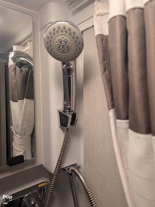 While on the road, if nature should call, you won't have to make bathroom stops because you have fresh water and a foot flush toilet in your rear wet bath.