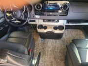 In the cab, leather captain's chairs swivel to face the living area, while the multimedia dash, power windows, keyless entry, and heated mirrors offer modern convenience. The cab transitions seamlessly into the main living area, with an interior height of about 76″ providing a surprising sense of space.