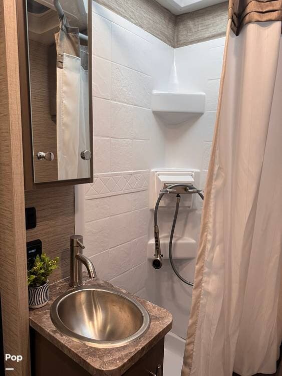 The kitchen is well equipped with solid-surface countertops, a two-burner gas cooktop, a convection microwave, and a 12V refrigerator.