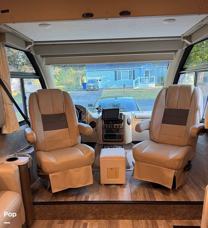 Sleeping accommodations include two twin beds that convert to a king-sized bed, a powered drop-down bunk over the cab, and a sofa bed in the living area.