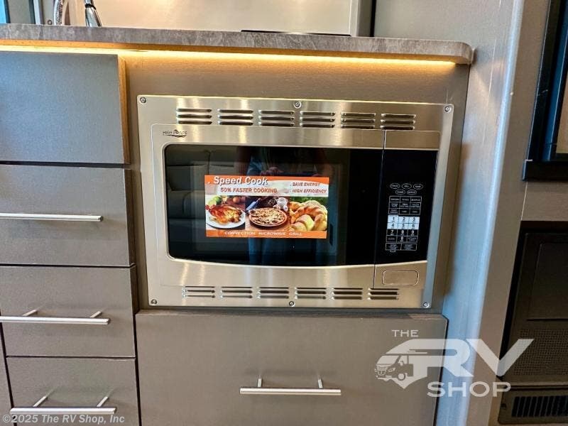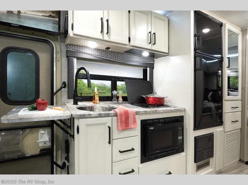The front cab of this Vegas Class A gas motorhome is excellently appointed with a stow-away coffee table, reclining/swivel leatherette captain's chairs, a living area speaker tied to the dash radio, and a 10" touchscreen dash radio with Bluetooth, Android Auto, and Apple CarPlay! A single slide holds the 68" sofa bed so that it isn't in your way as you walk back to the semi-private bedroom. The kitchen offers you a flip-up countertop for more room to chop veggies, and there are two TVs to provide you with all the entertainment you could need.