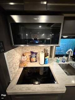 The kitchen is fully equipped with an induction cooktop, a residential refrigerator, a microwave, and a stainless steel double sink, providing you with the tools of a high-end home kitchen while on the road.