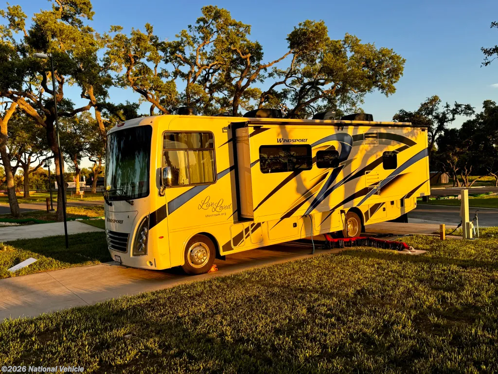 This Windsport comes fully equipped with all hoses, electrical cords, and accessories, plus a Blue Ox flat-tow system for easy towing. Recent maintenance includes new house and chassis batteries, a full tune-up (10/25), and new front tires, providing peace of mind for the next owner.