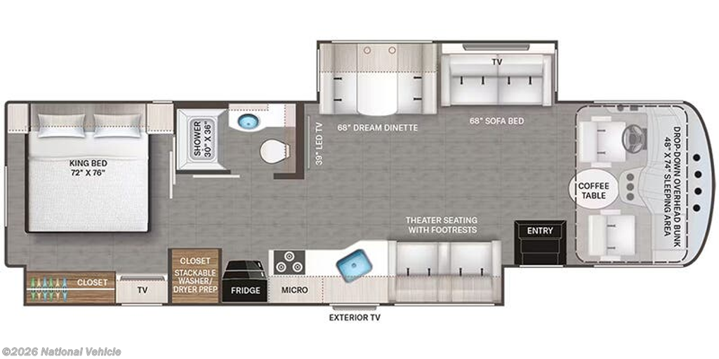 Four TVs total (living room, bedroom, overhead bunk, and exterior)