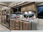 Load up the side-by-side and invite your friends along for the trip in this spacious toy hauler coach. Your guests can make the 8 x 10' 2" garage their bedroom at night since there is a queen-size drop-down overhead bunk here and their own 39" LED TV. During the day you can set up the patio deck that includes three seasons patio doors with a screen and privacy panels. You'll find the main living area cozy with its Dream dinette and sofa bed, plus there is a 39" LED TV here. The chef can prepare dinner on the two burner gas cooktop, or use the stainless steel convection microwave, and check out the residential refrigerator for all your perishables. The queen bed slide out in the private bedroom will provide a great night's rest, and you'll enjoy your own 32" LED and a wardrobe for your clothes. This model also includes a 39" LED exterior TV, that makes four TV's for all your entertainment needs!