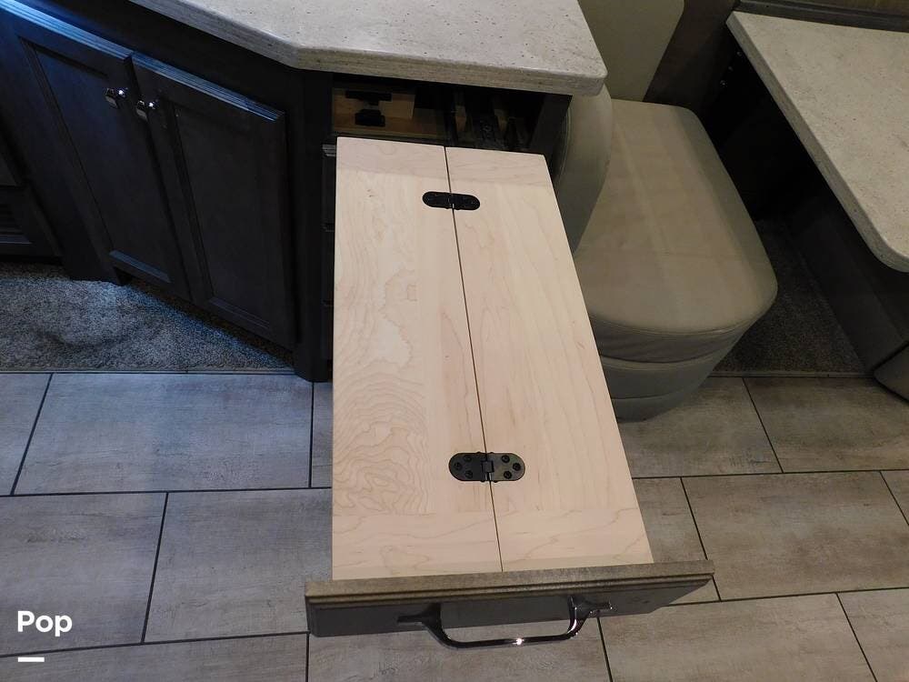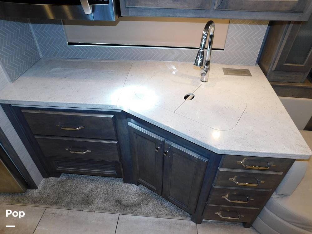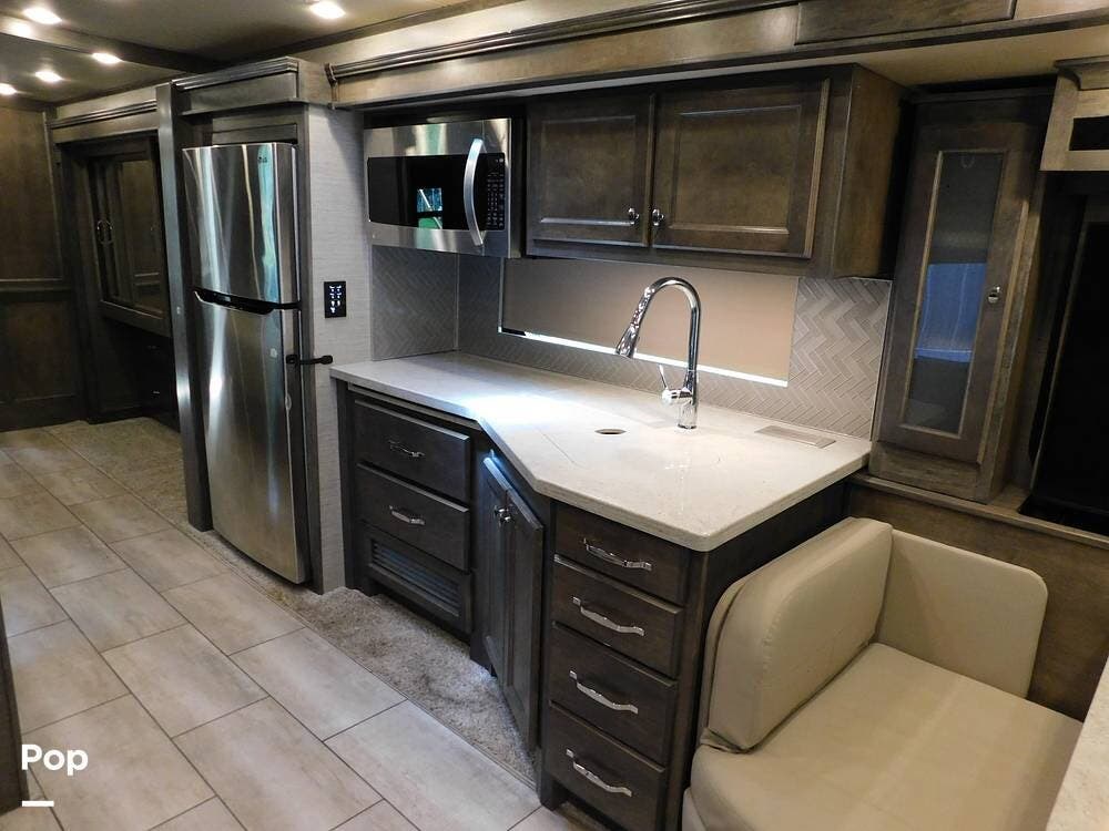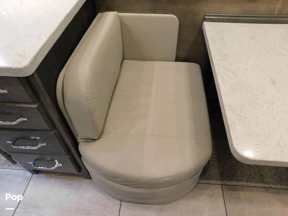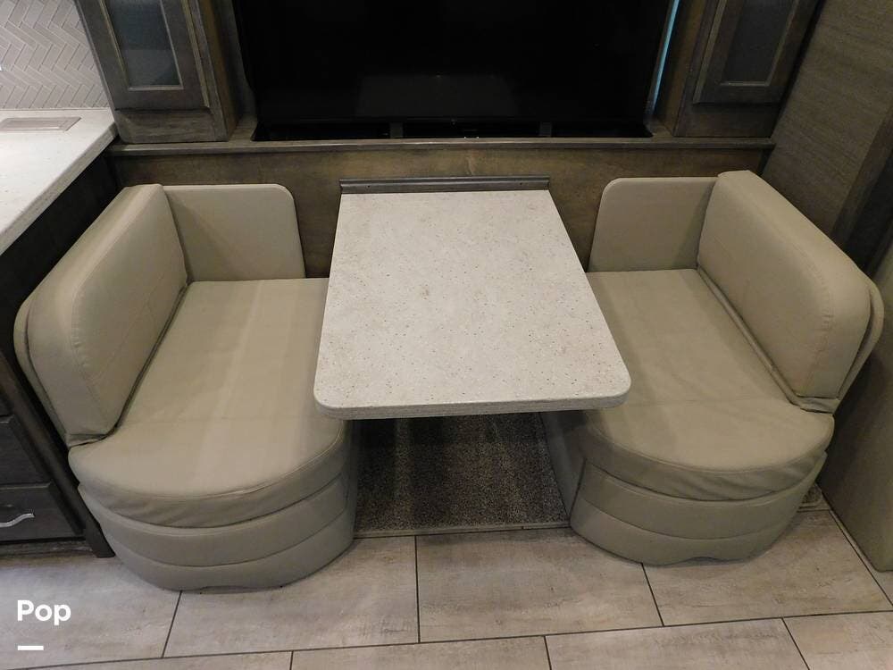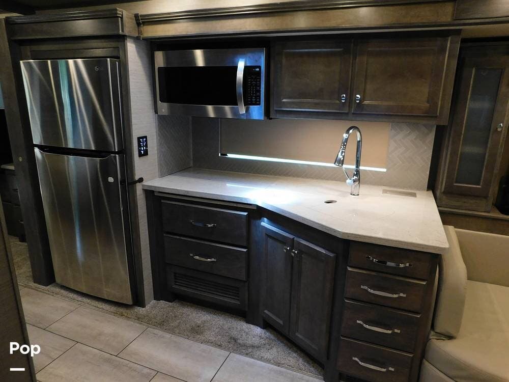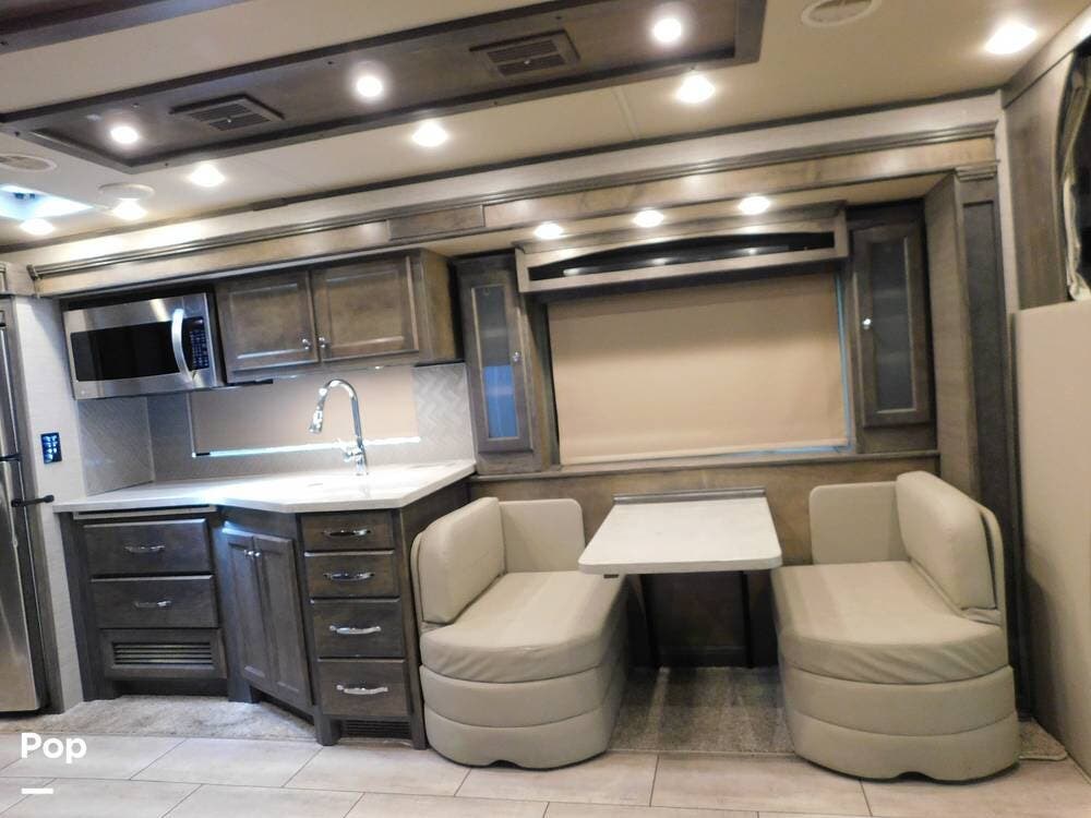 The kitchen is thoughtfully designed for both convenience and style. It features solid surface countertops, a stainless-steel residential refrigerator, a convection microwave, a three-burner cooktop, and ample cabinetry for storage. The dinette area provides comfortable seating for meals and can convert into an additional sleeping space if needed.