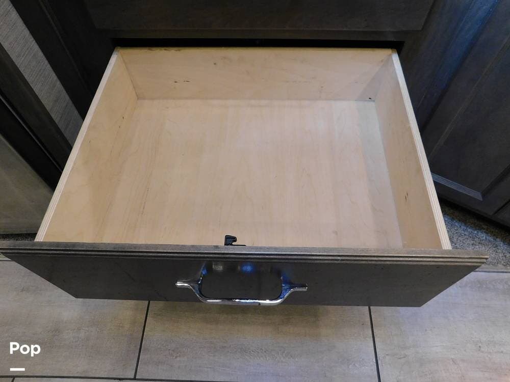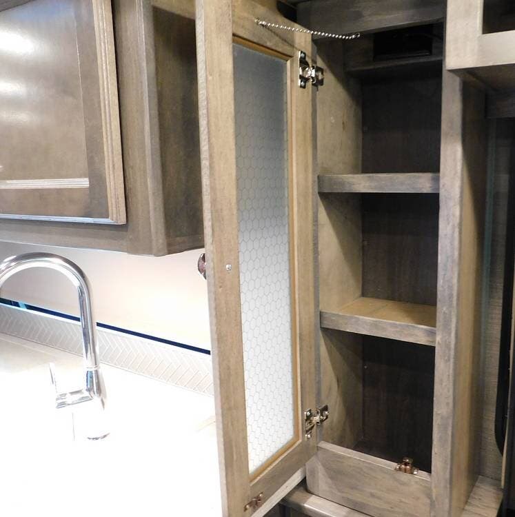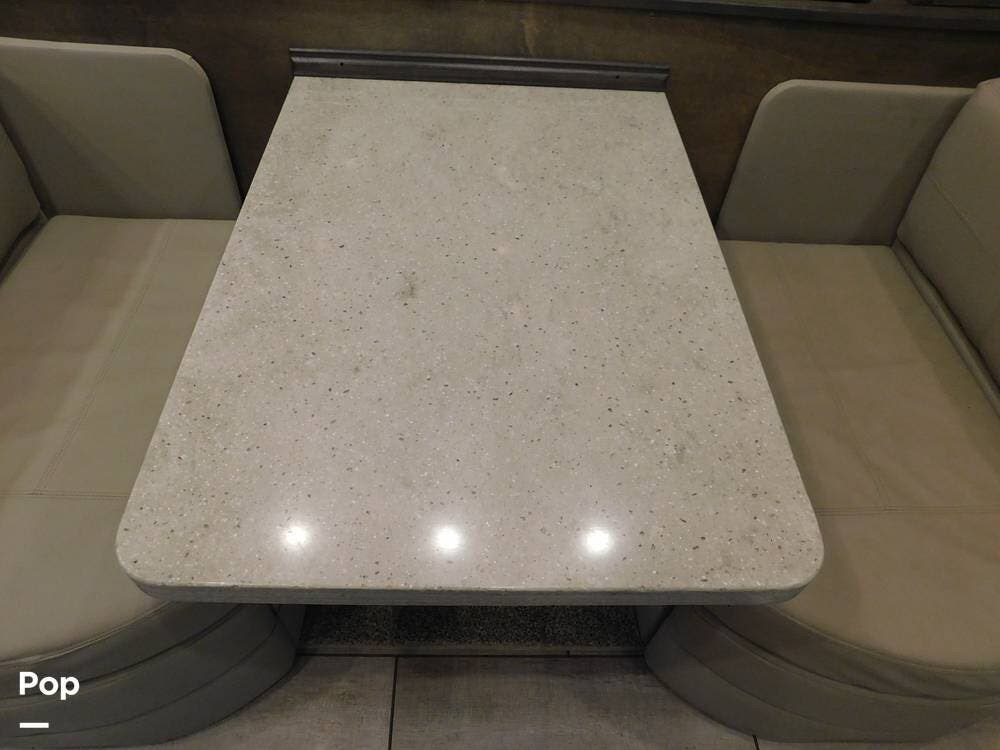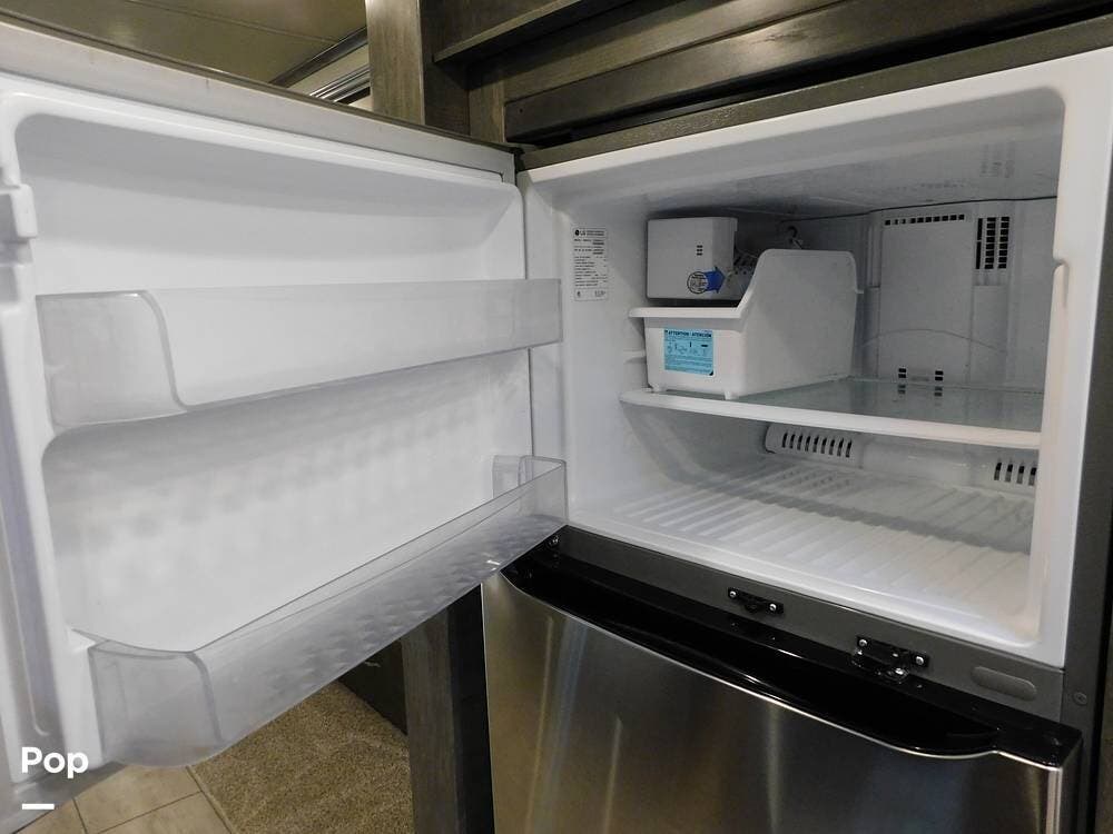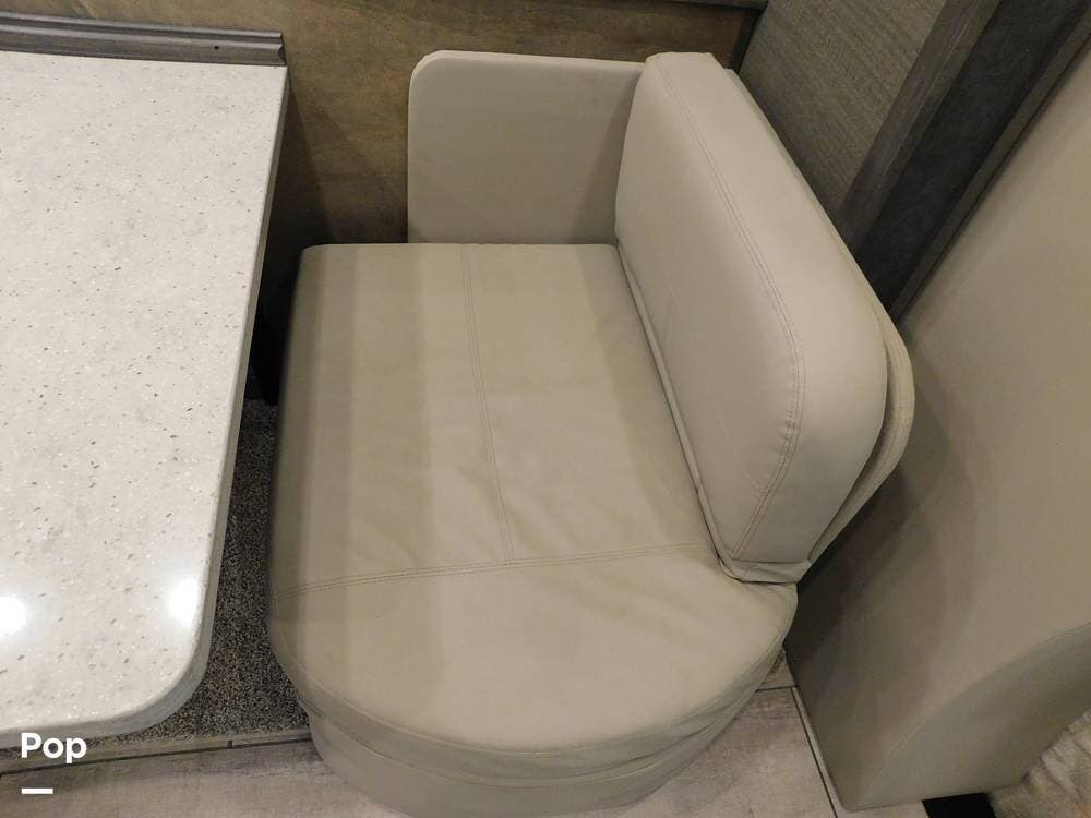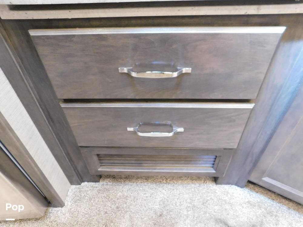 The kitchen is thoughtfully designed for both convenience and style. It features solid surface countertops, a stainless-steel residential refrigerator, a convection microwave, a three-burner cooktop, and ample cabinetry for storage. The dinette area provides comfortable seating for meals and can convert into an additional sleeping space if needed.