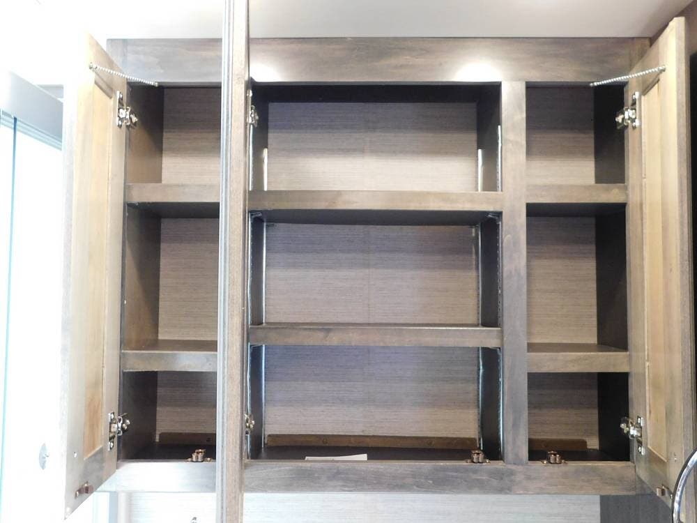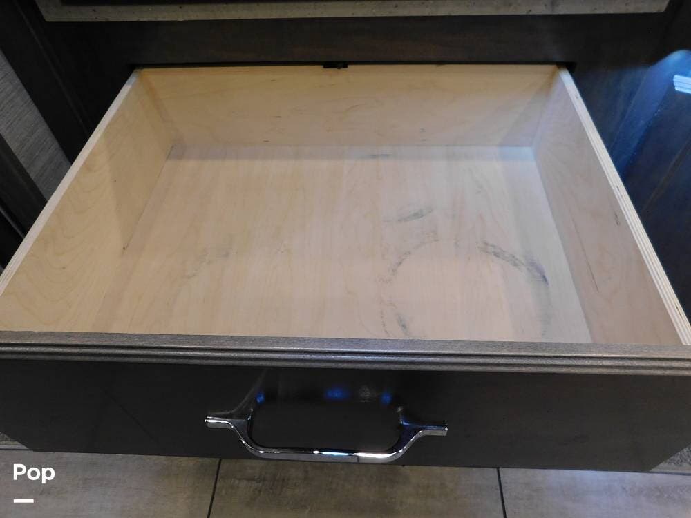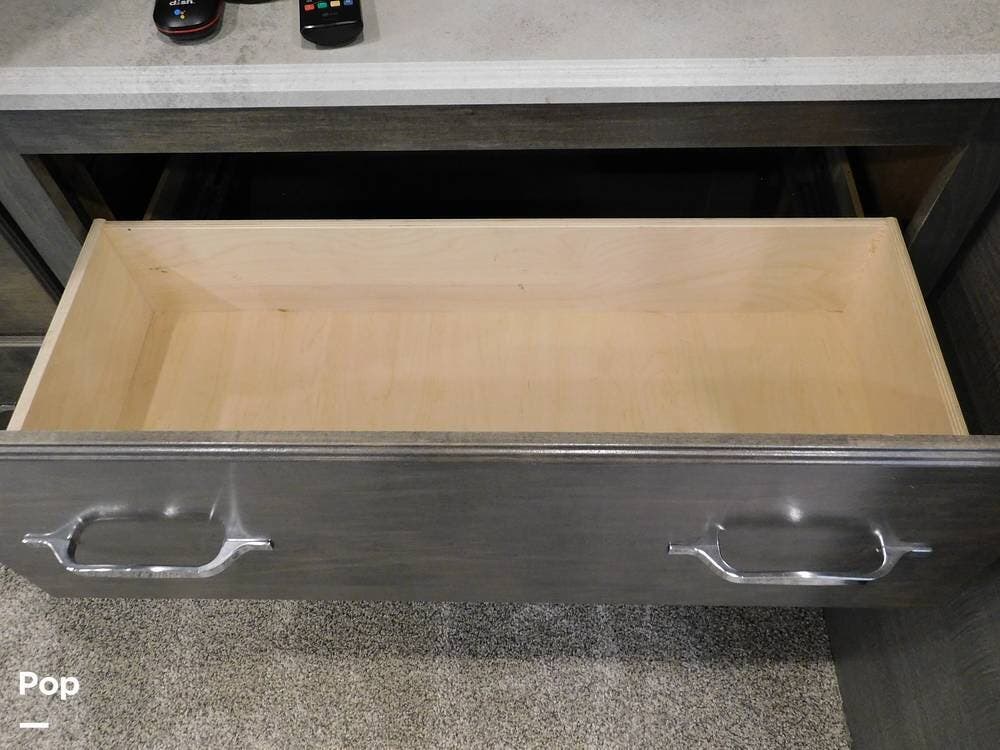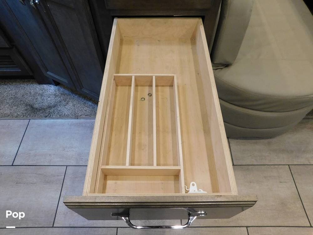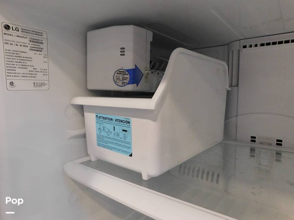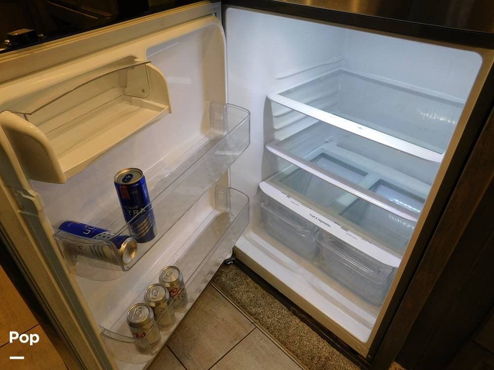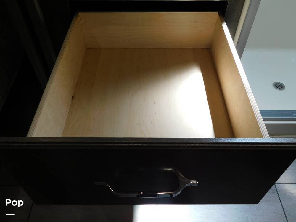 The kitchen is thoughtfully designed for both convenience and style. It features solid surface countertops, a stainless-steel residential refrigerator, a convection microwave, a three-burner cooktop, and ample cabinetry for storage. The dinette area provides comfortable seating for meals and can convert into an additional sleeping space if needed.