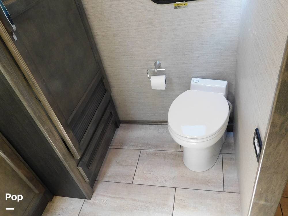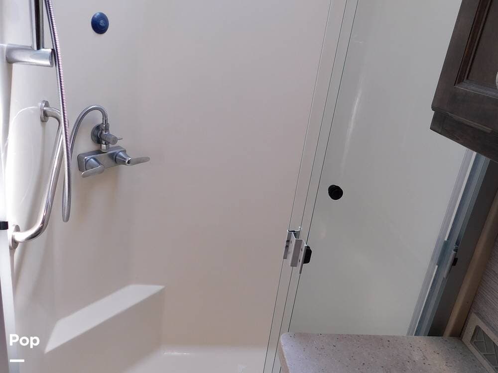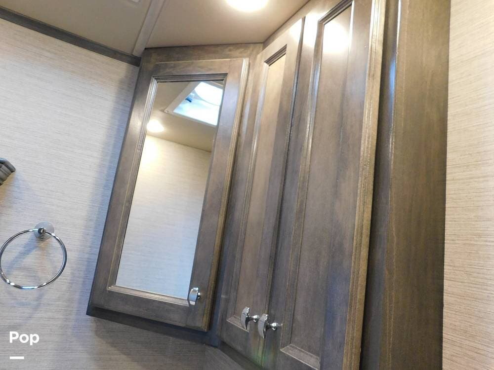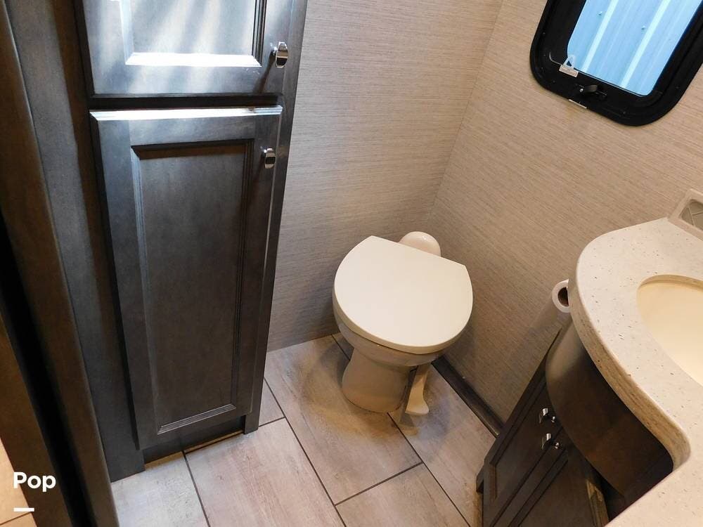 The 38BB features a full bath and a half bath, ensuring convenience for occupants. The full bath includes a spacious shower with glass doors, a stackable washer and dryer, a porcelain toilet, and a vanity with solid surface counters, while the half bath is perfect for guests or quick access during travel.