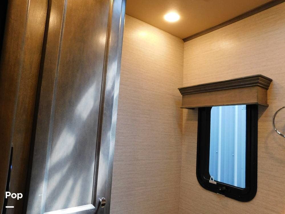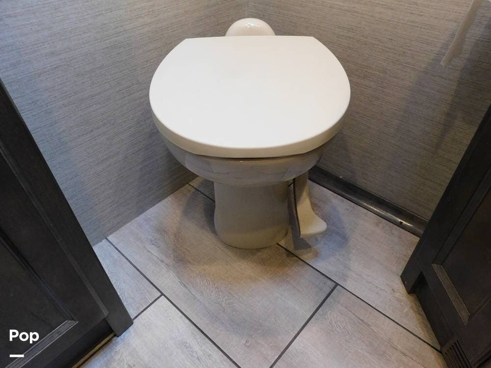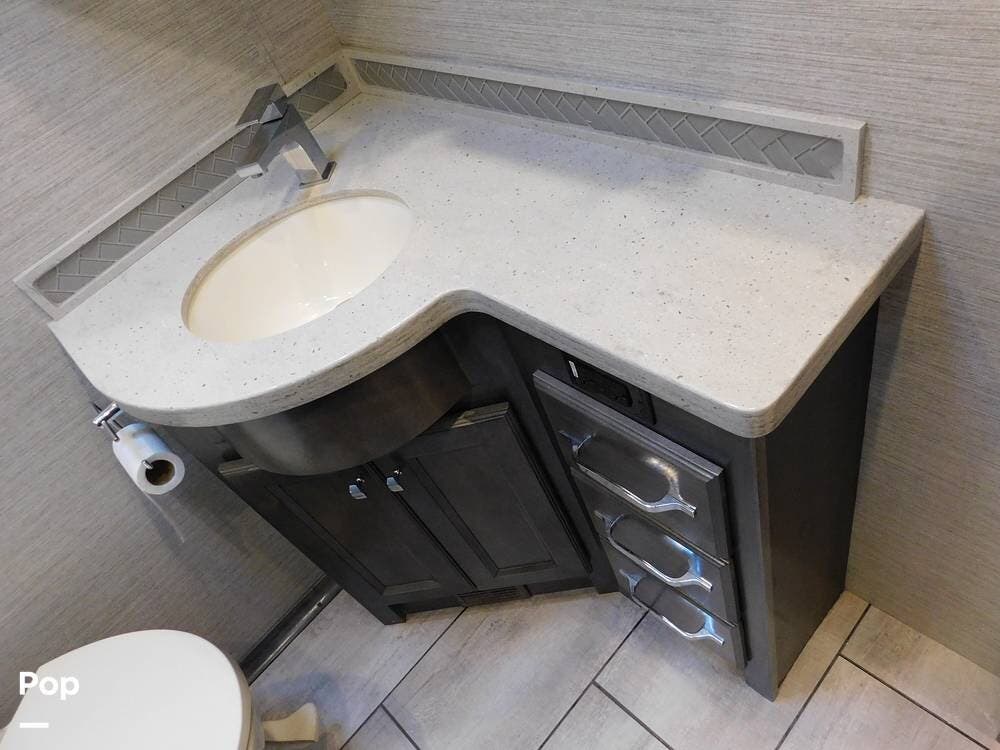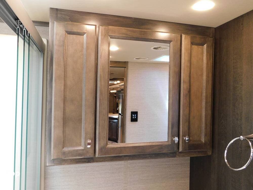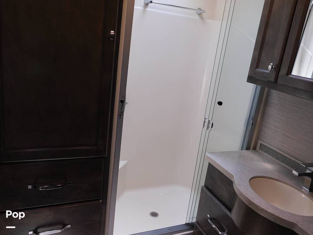 The 38BB features a full bath and a half bath, ensuring convenience for occupants. The full bath includes a spacious shower with glass doors, a stackable washer and dryer, a porcelain toilet, and a vanity with solid surface counters, while the half bath is perfect for guests or quick access during travel.