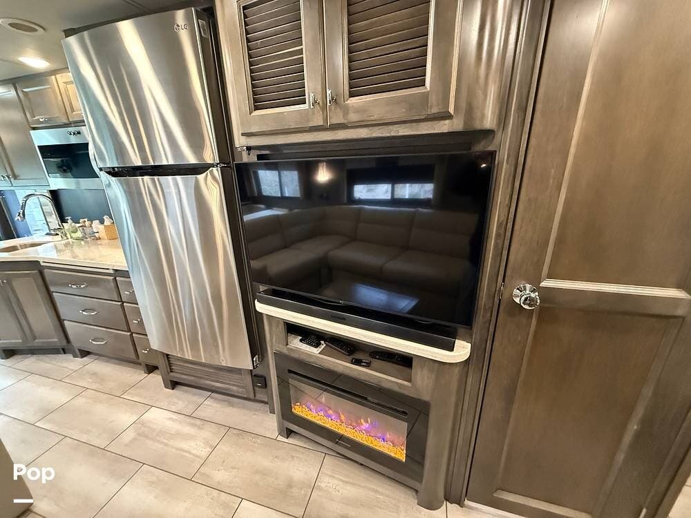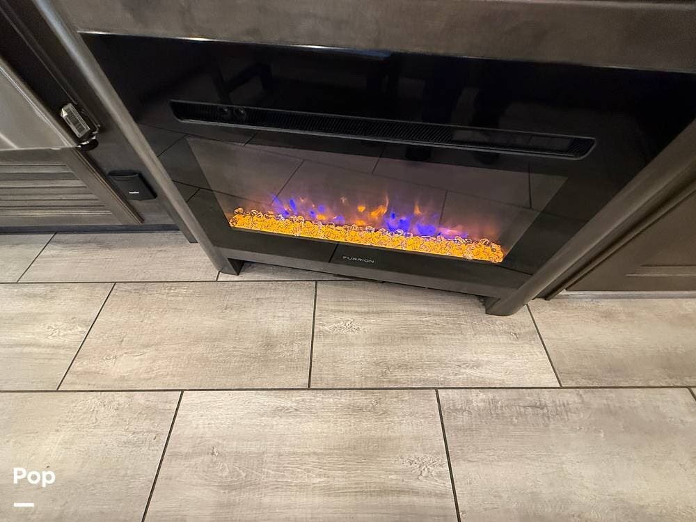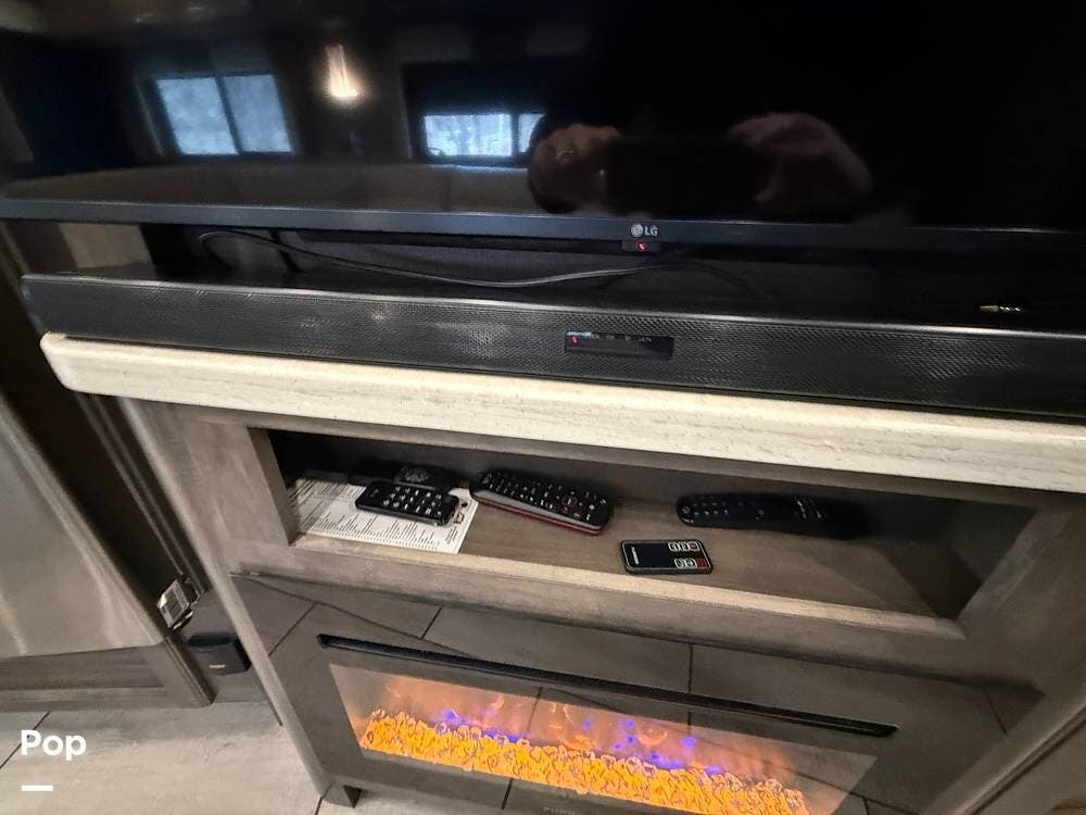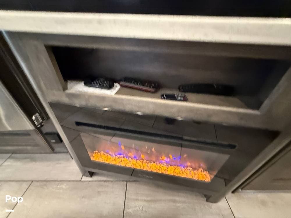 The living room is spacious, featuring theater seating, which provides comfort and entertainment options with a large flat-screen TV and a sound system. A cozy electric fireplace complements the ambiance, ideal for cooler evenings.