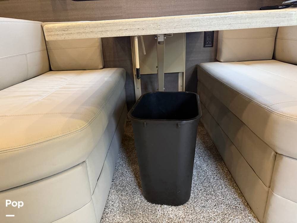 The 36UA has a residential-style kitchen equipped with solid-surface countertops, a stainless steel double sink, a residential refrigerator, a convection microwave, and a three-burner cooktop. The dining area includes a booth dinette. A central vacuum system is also included.
