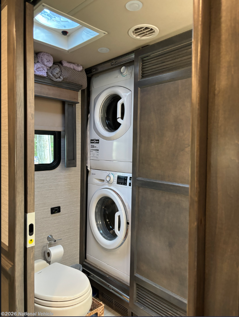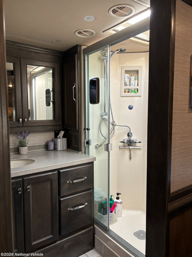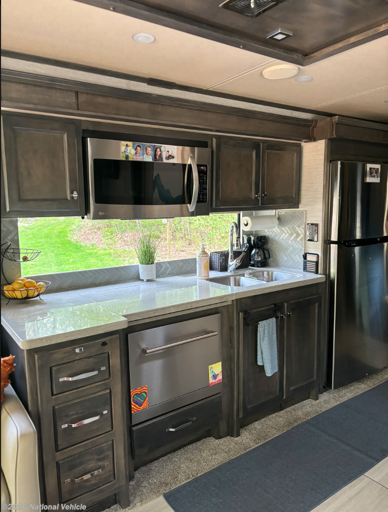 This well-appointed, beautifully styled Allegro RED Class A diesel motorhome is just waiting for you to begin your journey! This coach has everything you need for a truly residential experience with an excellent master suite in the back. This bedroom has its own full bathroom connected to it, and the bathroom comes with a skylight and LED light above the shower, a linen closet, a solid-surface vanity top, and a closet with a washer/dryer. The bedroom itself has lots of space with opposing slides, and the flat panel TV rests on the wardrobe across from the queen bed slide for easy nighttime viewing. Within the main living area, you have some extra lounge space with the free standing dinette with workstation and two sofas, and you will find two additional flat panel TVs in this area, one at the front of the cab and another on a lift behind the sofa bed. You also have an amazing kitchen that is stocked with a convection microwave, residential refrigerator, and two-burner induction cooktop.