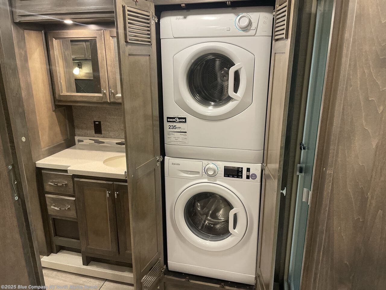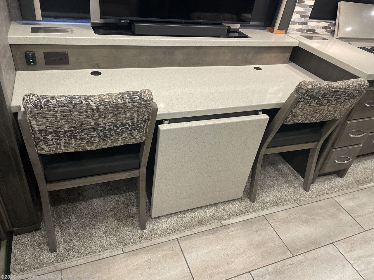 There are many standard luxurious features you will love about this motorhome! It also has many optional features you can add like the optional drop-down front bunk, the super sofa, the air coil sofa bed, the dinette with computer work station, and the dining bar with cabinet, printer, shelf, and file drawer below for an office on wheels. The king bed slide in the rear private bedroom offers a comfortable place to sleep, as well as the ultraleather flip and fold sofa bed and even the booth dinette once converted. The bedroom has lots of places to store your clothes between the bank of drawers below the single cabinet with TV, the wardrobe with drawers below, and the overhead cabinet with drawers below it. Plus, it has an entrance into the dual entry bathroom which has a shower with a seat and an area prepped to add an optional washer and dryer so you can extend your trip with clean clothes!