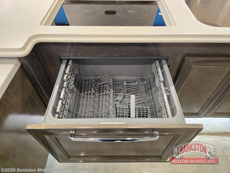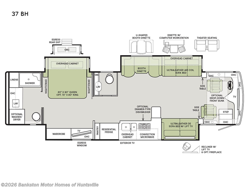 A bath and a half makes life easier on the road with this Phaeton motorhome! The master suite has a queen bed slide across from a wardrobe next a flat panel TV, overhead cabinets, and an egress window, plus access to the full rear bathroom. The bathroom not only has a shower with a seat and a linen closet, but also an area that is prepped to add an optional washer and dryer. The chef can prepare their best meals in the kitchen and clean up will be even easier if you choose to add the optional drawer-type dishwasher. After a long day of traveling, everyone can relax on either the ultraleather air coil sofa bed, the ultraleather DE sofa bed with a lift TV behind it, or play some games at the booth dinette. There are many other options you can add to customize it to fit your style like the optional drop-down front bunk, the recliner with lift TV and fireplace, the U-shaped dinette, a dinette with computer workstation, and theater seating!