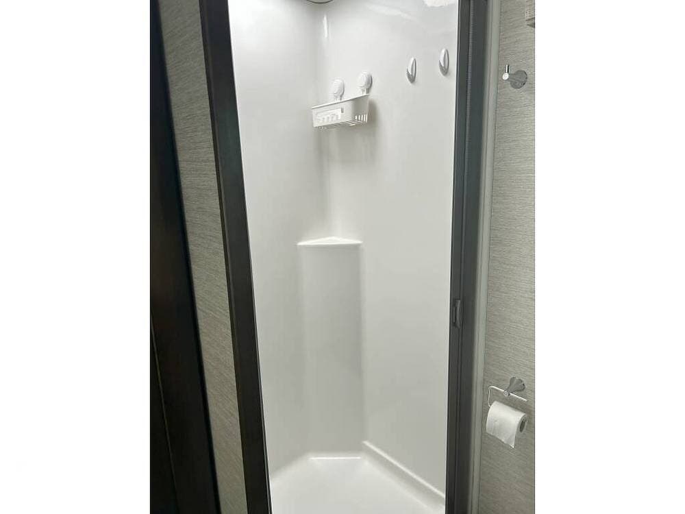 The full-width bathroom provides a sink with a large vanity, toilet, and a 36" x 30" shower.