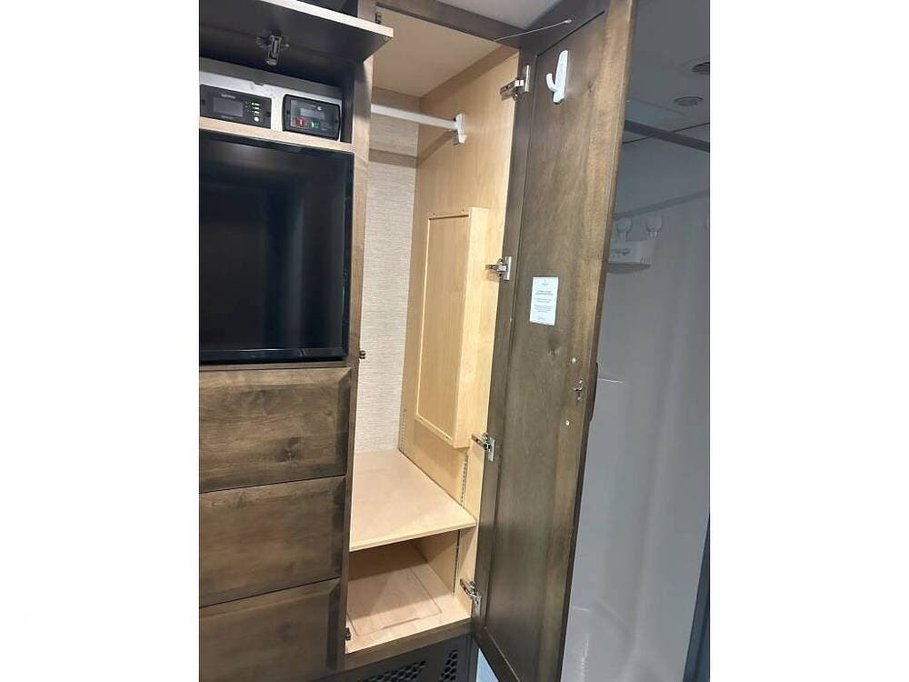 The bedroom features a 74" x 60" Murphy bed. Across is wardrobe storage and dresser storage. Relax and enjoy the 32" flat screen TV.