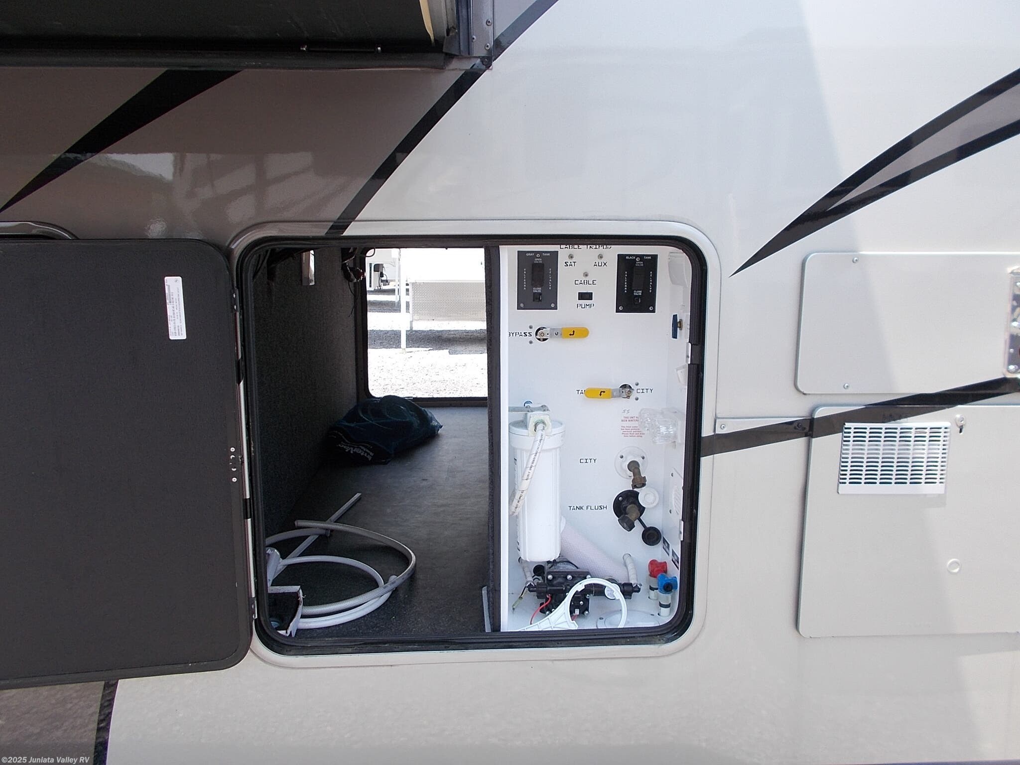 Alloy Wheels, Aluminum Entrance Steps, Automatic Leveling Jacks, Awning, Black Tank Flush, Enclosed Underbelly, Exterior Speakers, External Shower, Fiberglass Sidewalls, Full Body Paint, Heated Underbelly, Hitch, Ladder, Leveling Jacks, Pass Thru Storage, Power Awning, Power Roof Vent, Powered Landing Legs, PVC Roof, Roof Vent, Screen Door, Second Roof A/C, Skylight, Slam Latch Baggage Doors, Slideout, Slide-out Awning, Spare Tire Kit, Thermal Pane Windows, Tinted Windows -